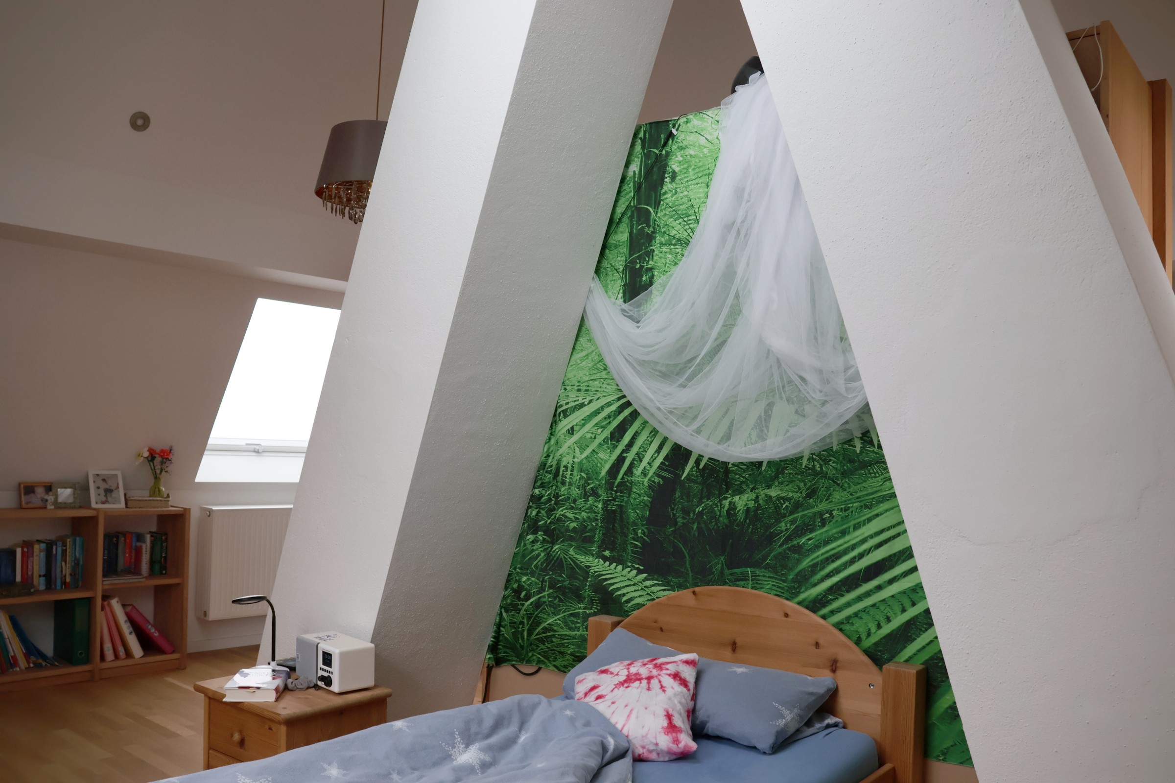 „Es gab Tage“, blickt Markus Schickert auf die Hochphase der Sanierung zurück, „da wollte ich mich im Klo einsperren und heulen.“ Und das, obwohl die Schickerts nicht blauäugig an die Unternehmung herangegangen waren. „Wir hatten mit dem Schlimmsten gerechnet“, erzählt der studierte Wirtschaftsingenieur, „und es ist alles eingetreten.“ Das in den 30er Jahren des letzten Jahrhunderts errichtete Gebäude brauchte unter anderem einen neuen Dachstuhl, ein neues Fundament und neue Böden, von denen manche auch nach unzähligen Säcken Estrich schief blieben – ein Makel, mit dem die fünfköpfige Familie bewusst und gut lebt. Genauso wie mit den unterschiedlichen, teilweise eher niedrigen Raumhöhen.