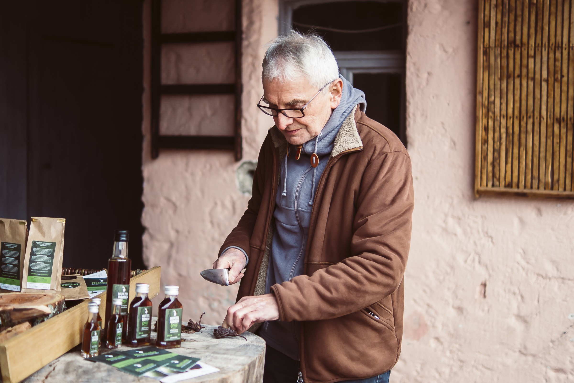 Mehr als einhundert eigene Bäume hat er selbst auf extensiv bewirtschafteten Flächen stehen. Einige davon sind 180 bis 200 Jahre alt, darunter sind seltene lokale Birnensorten, die nur noch in Fatschenbrunn vorkommen. Wie schon sein Vater hat er über die Jahre immer wieder neue Bäume nachgepflanzt. Schon als Kind hat er mitgeholfen, die Birnen aufzulesen, das Hutzelmachen war in seiner und den anderen Fatschenbrunner Familien selbstverständlich, und für ihn ist es das auch geblieben. Hauptberuflich macht er heute etwas ganz anderes, aber auf die Frage, wie viel seiner Freizeit er mit dem Thema Hutzeln verbringt, hat er erst mal keine Antwort. Für ihn gibt es keinen Unterschied zwischen Freizeit und Arbeit, „das ist doch keine Belastung“ sagt er fast ein wenig erstaunt. Der Urlaub geht sowieso für das Hutzelmachen drauf, im Herbst sind Hümmer und seine Familie im Dauereinsatz. Birnen ernten, aussortieren, auf spezielle Holzrahmen, die „Därrhärrli“ setzen und die Birnen in die Därre schieben. Drei bis fünf Tage dauert es, bis eine Birne trocken ist. Dafür füttert Franz Hümmer den Ofen alle sechs Stunden mit Holz aus dem eigenen Wald, sortiert fertige Hutzeln aus, legt frische Birnen nach und schichtet die Gitter je nach Trocknungsgrad der Früchte permanent um. Denn die vielen verschiedenen Sorten verhalten sich beim Dörren eben auch unterschiedlich. Viel Erfahrung verlangt das – und eine große Liebe zu den kostbaren Rohstoffen.