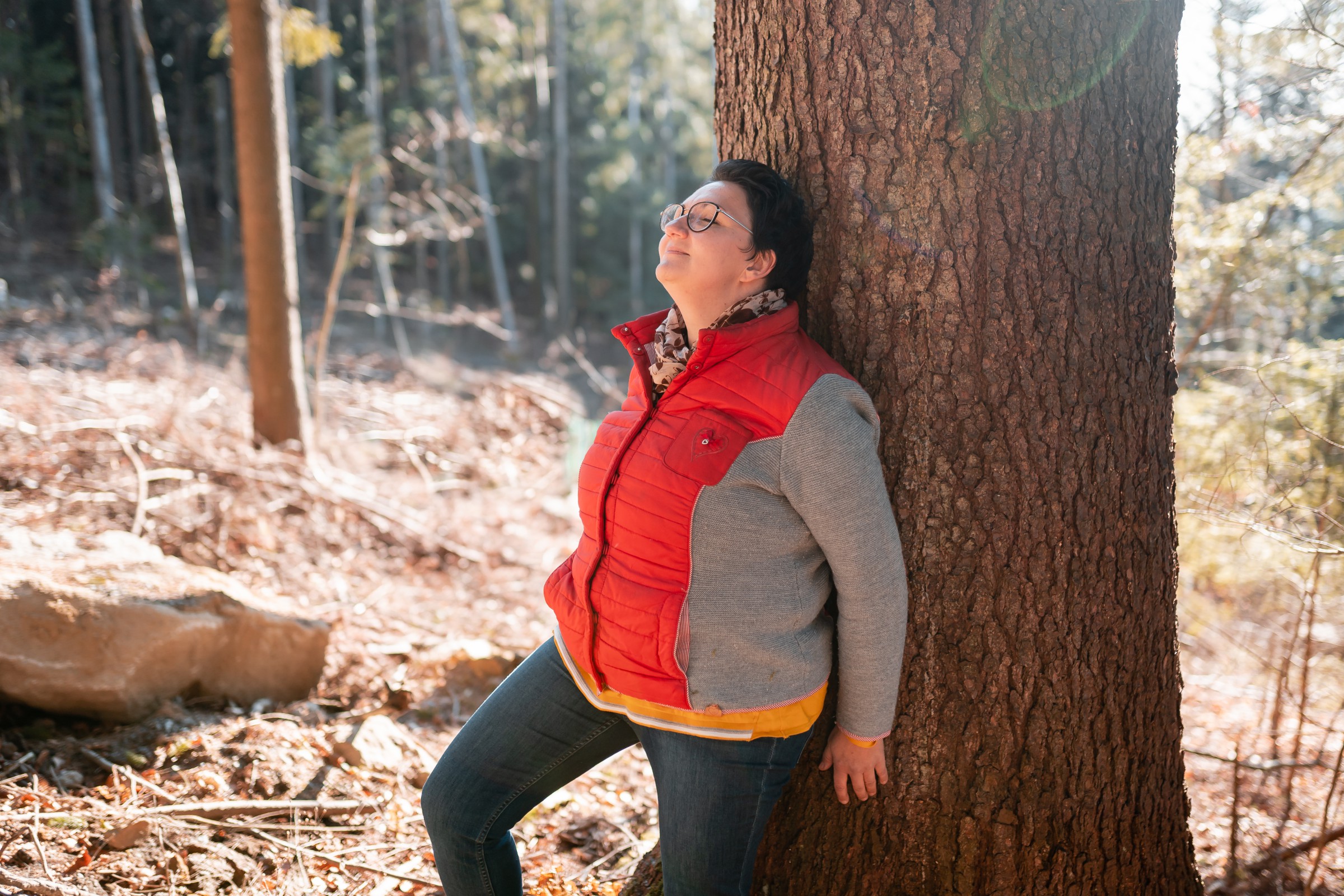 Deshalb wird es ab 2020 eine Art Lehrpfad zum Waldbaden auf dem Kadernberg geben. „Wir wollen dazu einladen, auch ohne Führung die ein oder andere Atemübung oder Meditation auszuprobieren“, sagt Veronika Egger. Dafür entwickelt sie Infotafeln, die kurze Impulse und Informationen dazu geben. „Natürlich ist auch Pilze sammeln eine Art von meditativer Übung“, sagt sie, aber wer mit ihr durch den künftigen Waldbadewald geht, bekommt eine Ahnung davon, was sie ihren Gästen alles mitgeben kann. „Es gibt verschiedene Phasen beim Waldbaden“, erklärt sie, „das beginnt schon mit dem Ankommen, dem Einstieg in eine neue Welt. Deshalb eignet sich der Wald so gut, dort ist die Zivilisation draußen und ich bin in einem archaischen Umfeld“. Sie setzt sich flugs auf einen moosbewachsenen Granitstein und scheint sofort eins mit der Umgebung zu werden. Und so, wie sie dann bilderreich von den weiteren Waldbade-Stationen – einer Baumgarderobe, einem Waldfußabstreifer, den Sinnesübungen – erzählt, ahnt man schon, dass es sich lohnen wird, sich mit ihr auf einen Tauchgang in den Wald zu begeben.