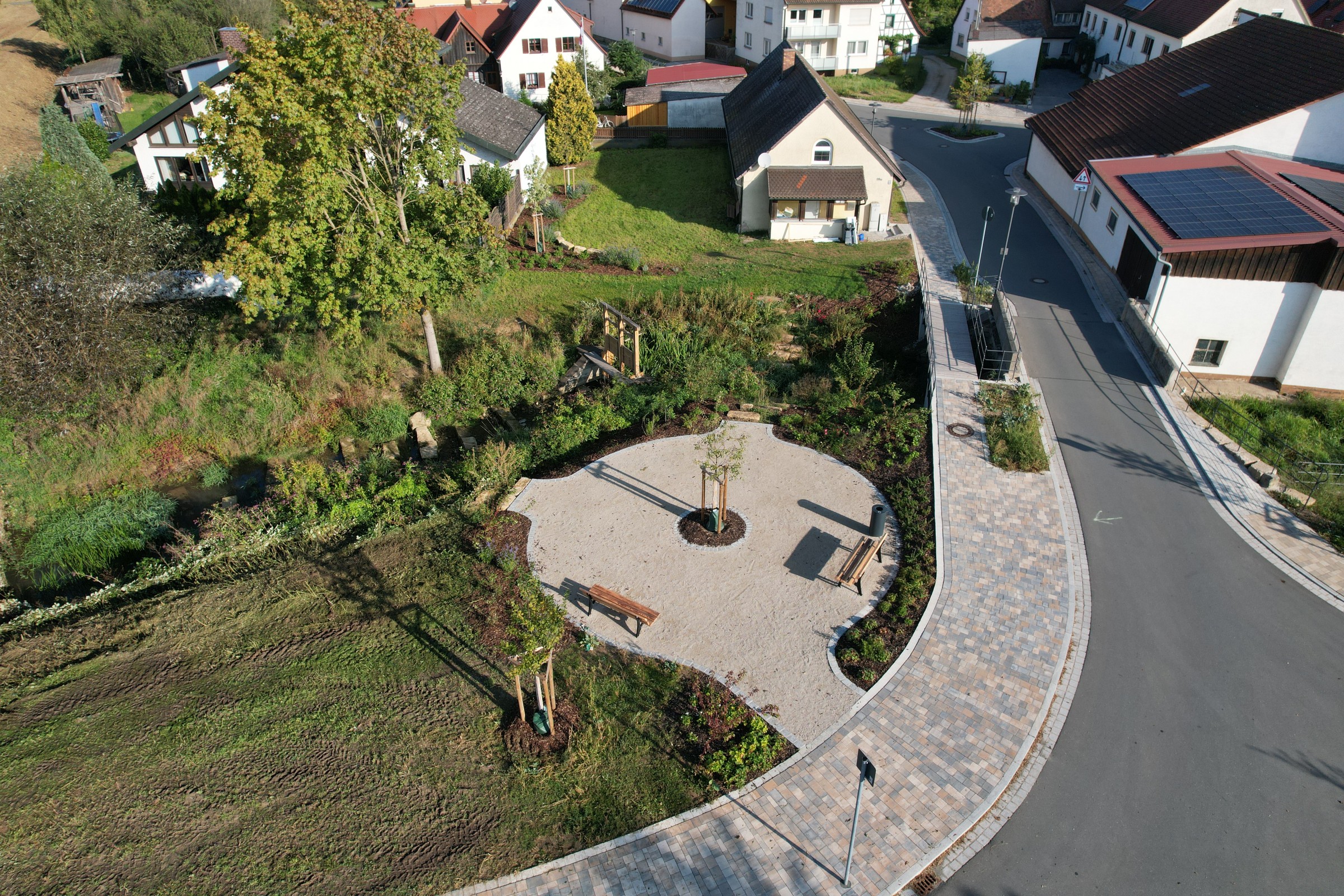 Im Vordergrund steht die Neugestaltung der Dorfmitte. Sie umfasst die „Bamberger Straße“ und die „Höchstädter Straße“ sowie den Eggerbach, der zentral zwischen den beiden Straßen verläuft. Dabei wurde die Gestaltung der Randbereiche sowie der Vorgärten in den Fokus genommen. Zentraler Gestaltungspunkt ist die Öffnung des Eggerbaches, um eine ökologische Aufwertung zu erreichen und den Bach als Gestaltungselement für die Bürgerinnen und Bürger erlebbar zu machen. Die betonierten Ufermauern wurden zurückgebaut und ein natürliches Bachbett unter gewässerökologischen Gesichtspunkten angelegt. Besonderes geachtet wurde dabei auf eine naturnahe Uferbegrünung. Die Böschungen wurden an steilen Bereichen mit einer Natursteinmauer aus Sandsteinquadern befestigt, die zudem einen wichtigen Lebensraum für zahlreiche Lebewesen bietet. Im Zuge der Aufweitung des Eggerbaches wurde ein Wasserspielplatz angelegt, um das Element Wasser für Kinder zugänglich und erlebbar zu machen. Ferner wurde eines der historischen Backhäuser saniert sowie eine neue Bushaltestelle errichtet. Durch die umfassende Entsiegelung und Umsetzung ökologisch wertvoller Maßnahmen entlang des Eggerbaches wird maßgeblich zur Verbesserung des Kleinklimas in der Ortschaft beigetragen. Die Maßnahmen leisten einen wichtigen Beitrag zum Erhalt der Artenvielfalt und reagieren nachhaltig auf die Herausforderungen und Folgen des Klimawandels.