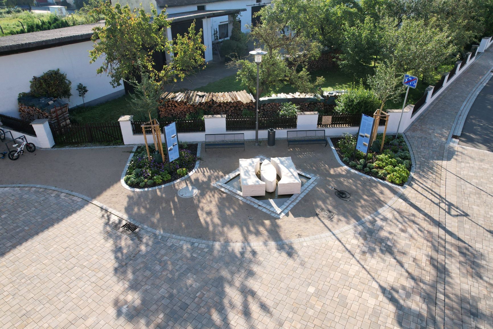 Die Bürgerinnen und Bürger kommen gerne auf dem Platz vor der Pizzeria zusammen, der durch die Dorferneuerung wesentlich aufgewertet ist. Wo vorher Asphaltflächen dominierten, fördert nun eine wassergebundene Wegedecke aufgrund ihrer verschiedenen Gesteinsschichten die Nachhaltigkeit und wirkt der Versiegelung entgegen.