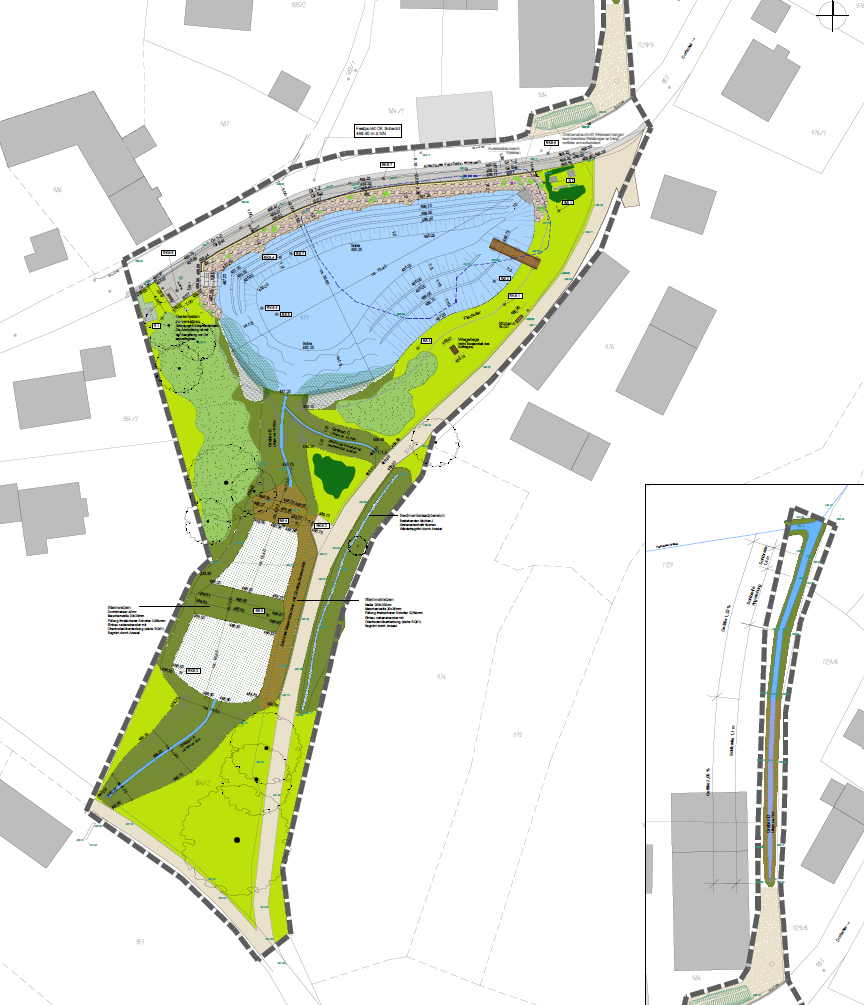 Die Aushubarbeiten schufen ein zusätzliches Einstau-Volumen von 1000m³ - bei Extremwetterereignissen kann der Wasserspiegel noch um zusätzliche 45cm ansteigen. Damit wird das Oberflächenwasser im Weiher und Stoffe in den vorgelagerten Absetzbecken zurückgehalten. Eine strukturreiche Uferbepflanzung wird vielen Tier- und Pflanzenarten ein neues Zuhause geben und eine Verbindung zu den nahegelegenen Hecken und Bäumen in der Landschaft herstellen. Eine Verschränkung von Dorf und Landschaft ist der Kern des Konzeptes.