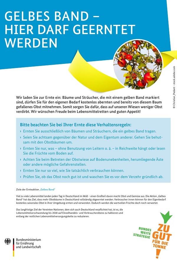 Doch nicht immer ist die Ernte von Obstbäumen durch Nichteigentümer illegal. Etwa wenn die Besitzer der Obstbäume, wie Privatleute oder Gemeinden, die Ernte nicht selbst nutzen wollen und die Bäume freigeben. Dies geschieht durch Hinweisschilder oder über das sogenannte „Gelbe Band“, einer Ernteaktion des Bundesministeriums für Ernährung und Landwirtschaft. Damit sollen nicht genutzte Obstbäume abgeerntet und mehr Obst verwertet werden. Vor allem dient es aber dazu, um Lebensmittelverschwendung vorzubeugen. Das gelbe Band an Obstbäumen signalisiert: Hier dürfen Verbraucherinnen und Verbraucher für den Eigenbedarf kostenlos Obst ernten.