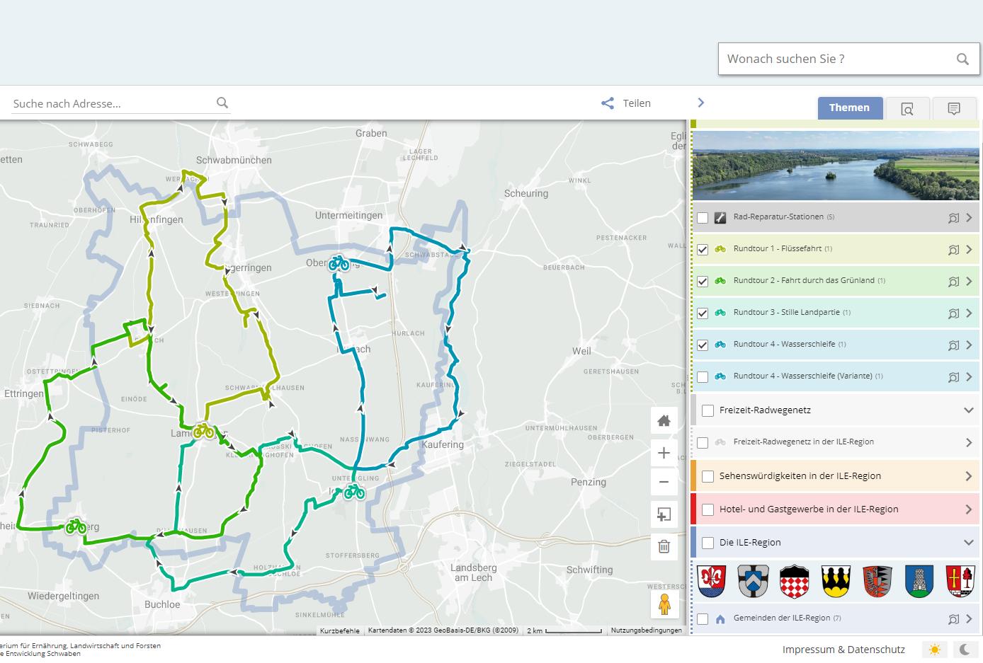 Ein besonderes Merkmal der Rundtouren: Sie fügen sich nahtlos ins bestehende Radwegenetz ein. Eigene Schilder waren daher nicht notwendig, stattdessen konnten die Ressourcen in die Web-Applikation fließen, die flexibel erweitert werden kann: um aktuelle Bilder, zusätzliche Varianten oder Neuerungen. So wie die Reparaturstation bei Igling. Dort finden Radfahrer nach einer Panne das nötige Werkzeug, um das Rad wieder fahrtauglich zu machen. Und dann kann es weitergehen auf „Wasserschleife“ oder „Stiller Landpartie“. Und wer ausreichend Reserven oder ein E-Bike hat, kann von der „Landpartie“ gleich noch auf die westlicheren Rundtouren entlang der Flüsse oder durch das Grünland einbiegen.