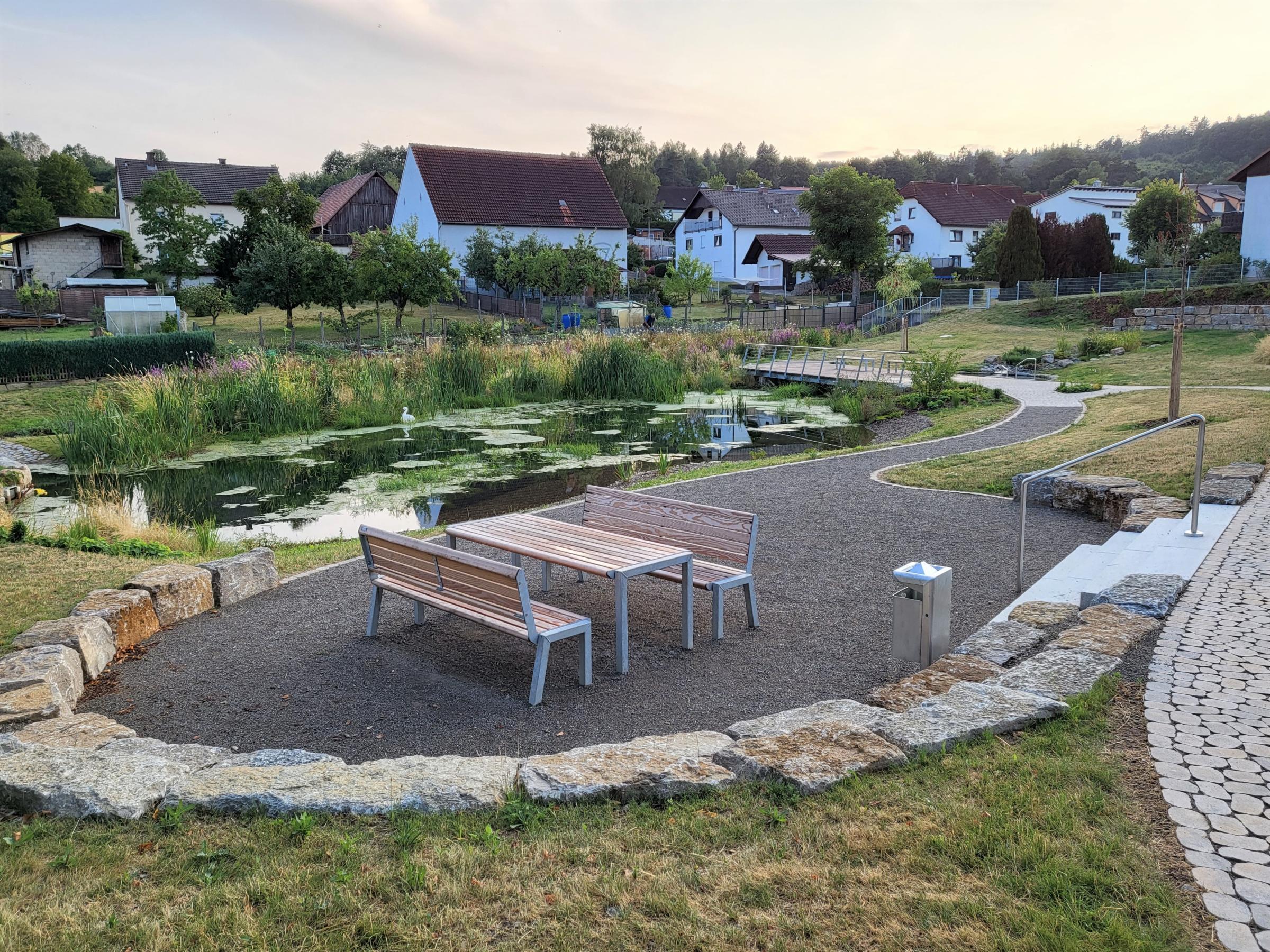 Der See oberhalb des Kindergartens diente ursprünglich zur Aufzucht von Forellen, wurde aber 2015 stillgelegt. Zwischenzeitlich hatten sich „grüne Frösche“ angesiedelt. Die mussten eingefangen und für die Dauer von Bauarbeiten, die im März 2022 begannen, nach Stangenroth umquartiert werden.