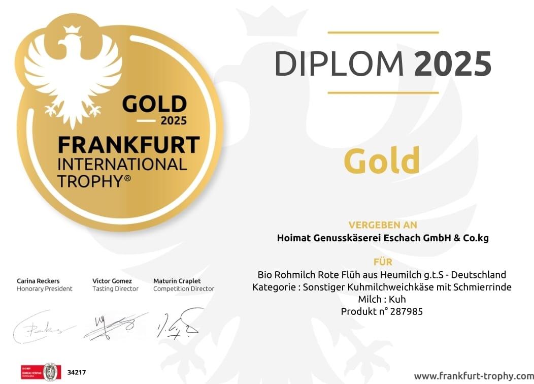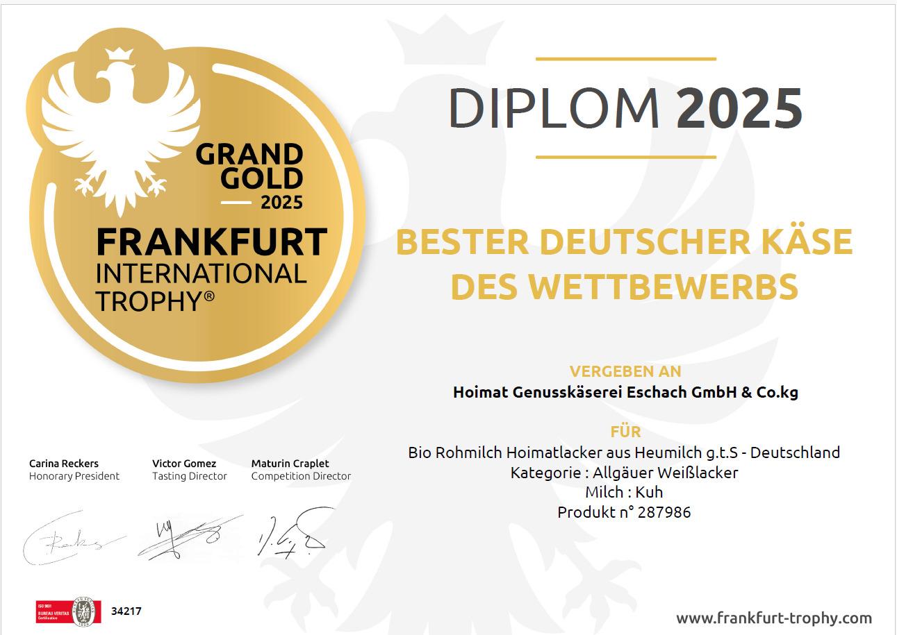 Der Käse hat eine halbfeste Struktur, ist aber immer noch streichfähig und weich und „eine echte Geschmacksbombe“. Das sehen nicht nur die drei „Hoimat“-Macher so. Der internationale Käse- & Milchproduktewettbewerb „Frankfurt International Trophy” hat den Hoimatlacker als „Bester deutscher Käse des Wettbewerbs” ausgezeichnet. Auch die Bio Rote Flüh der „Hoimat Genusskäserei“ hat in ihrer Kategorie Gold gewonnen. Eingereicht wurden über 700 deutsche und internationale Produktproben, die von einer unabhängigen Jury aus Experten, Fachleuten und Amateuren bewertet wurden.
