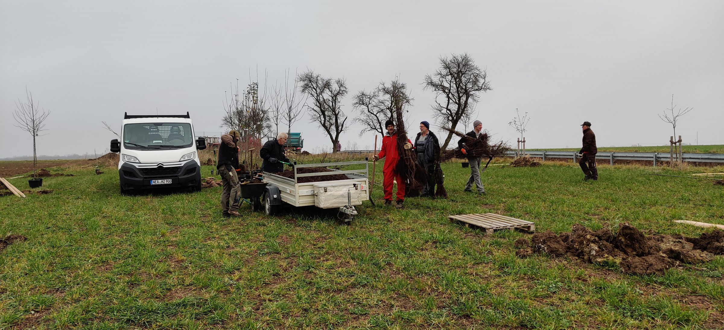 Ein großer Schritt hin zur Umsetzung wurde im Herbst 2021 getan: auf einer bislang verpachteten Fläche haben die Eheleute eine neue Streuobstwiese angelegt. Insgesamt 35 Hochstämme alter regionaler Obst- und Walnussorten wurden gepflanzt, darunter Gravensteiner, Jakob Fischer und Goldparmäne. Zahlreiche Helferinnen und Helfer aus der Dorfgemeinschaft haben die Baumanns hierbei unterstützt. Neben den Bäumen wurde auch noch eine 50 Meter lange Landschaftshecke gepflanzt und zwei Steinbiotope angelegt.