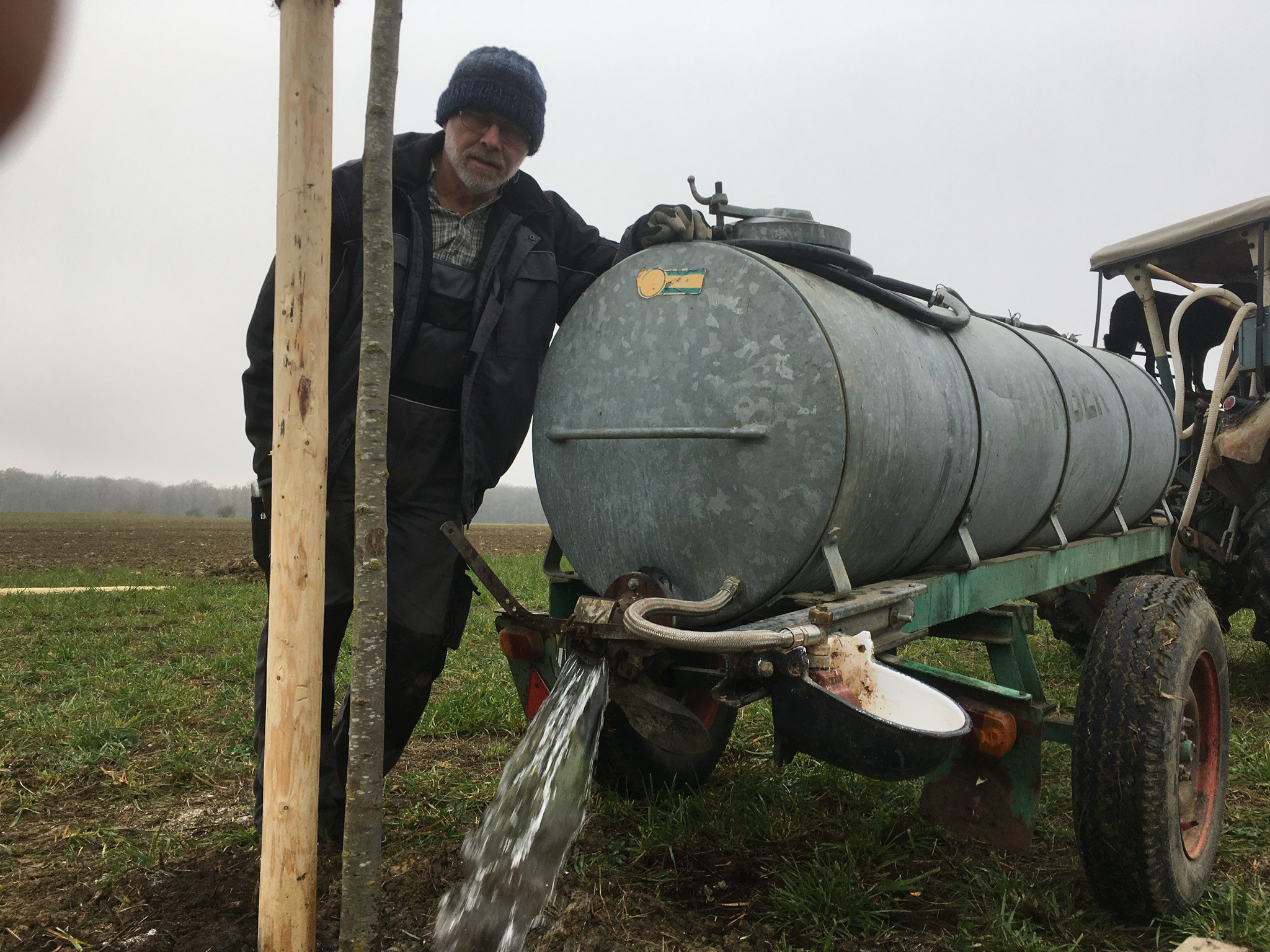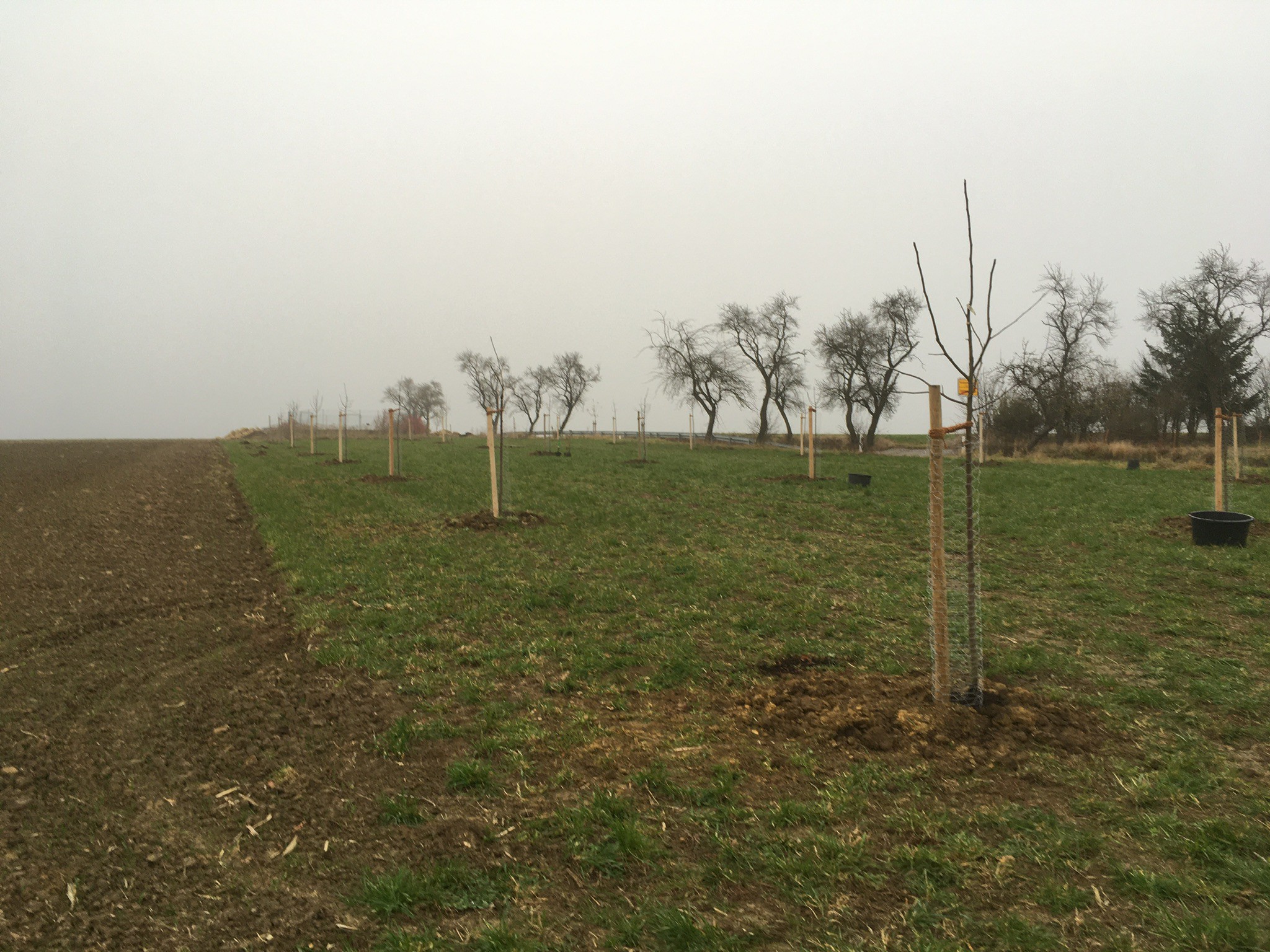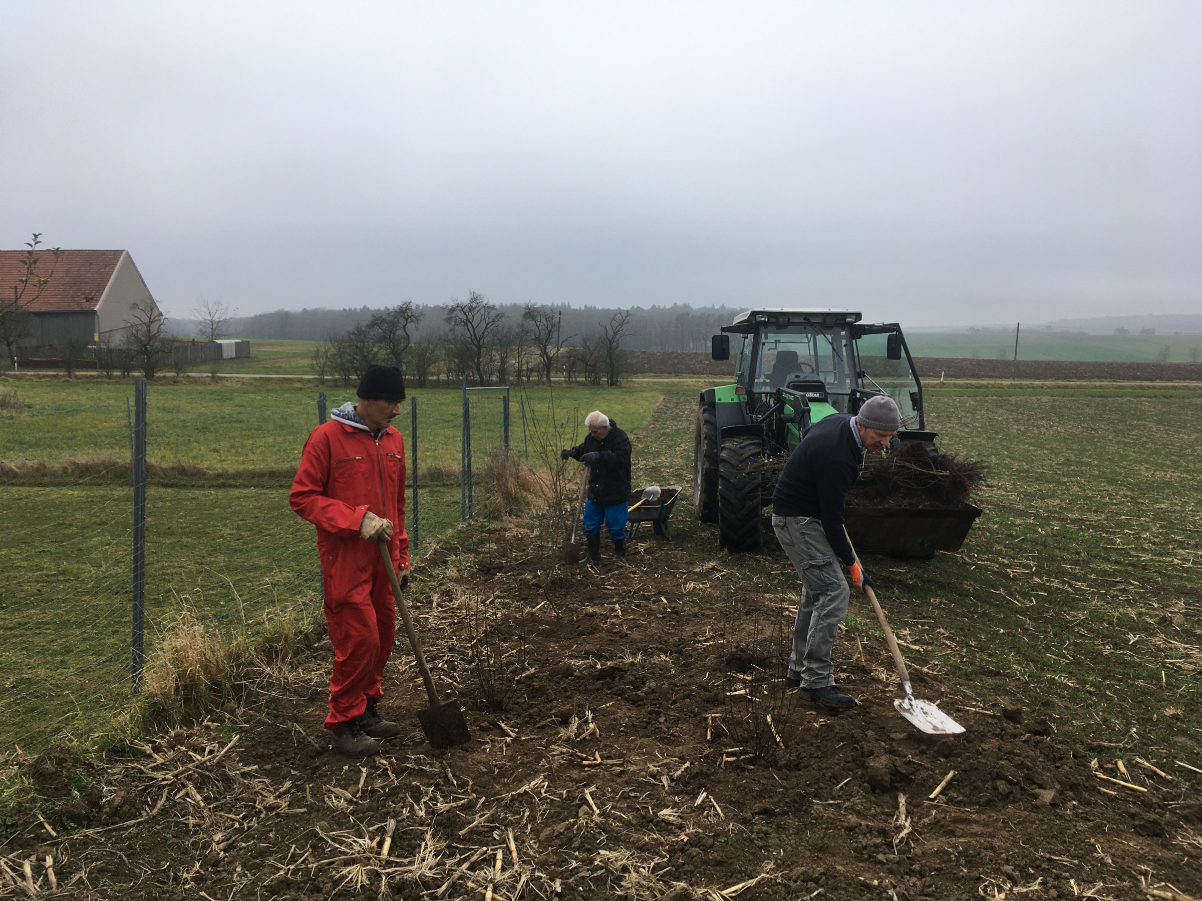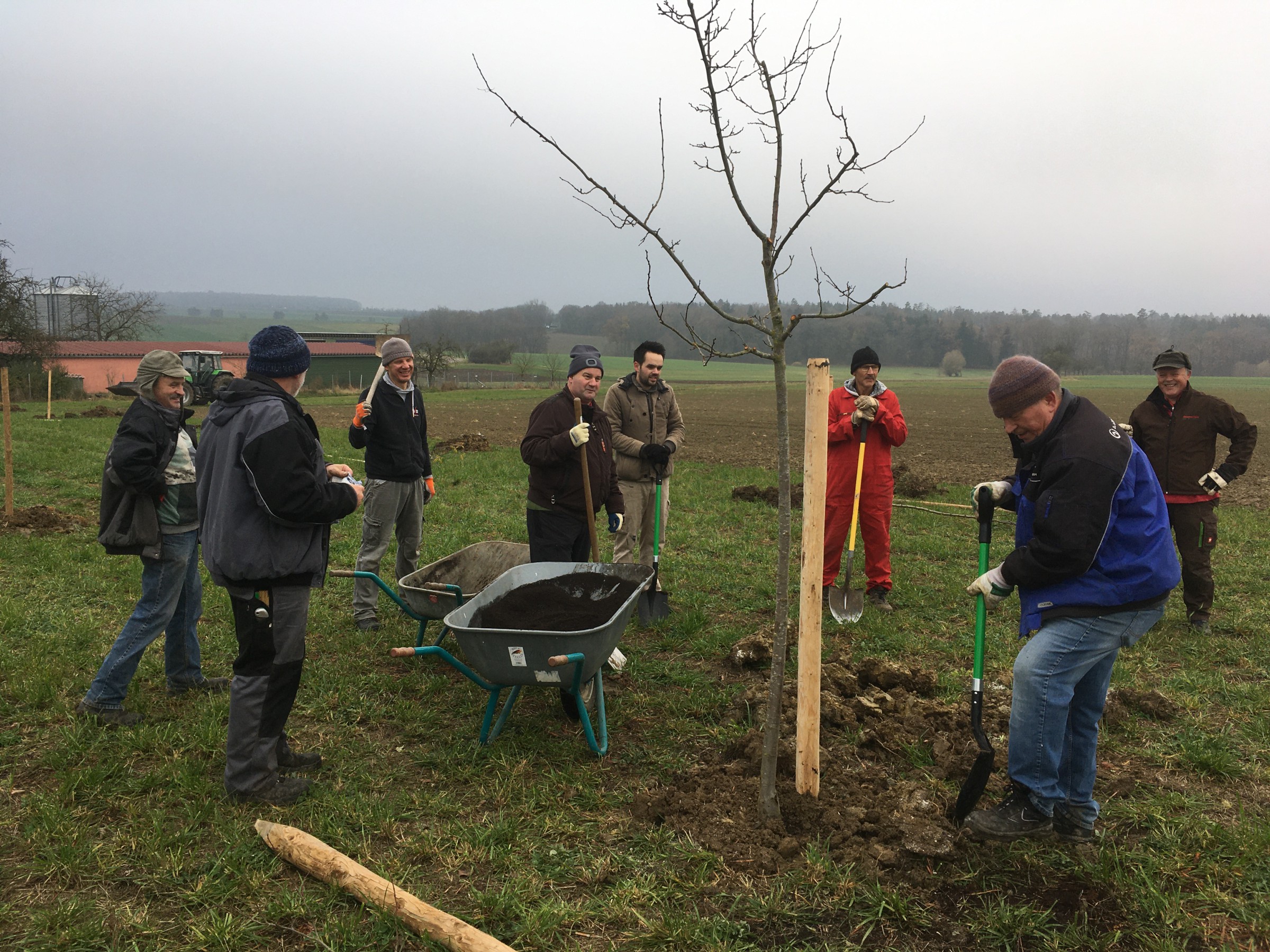 Baamaland - so nennt man in der Region um Uffenheim und Bad Windsheim die Streuobstwiesen. In vergangenen Jahrzehnten sind vor allem in guten Ackerlagen die Obstbäume immer weniger geworden. Claudia und Helmut Baumann aus Hinterpfeinach sind schon lange sehr engagiert den Baumbestand auf ihren Flächen zu erhalten und auszuweiten, denn „es muss ja einer machen. Und es ist an der Zeit, auf seine Umwelt zu achten und auch etwas zurückzugeben.“ findet Claudia Baumann. Denn die Obstbäume und die dazugehörige Wiese bieten zahlreichen Tier- und Pflanzenarten Nahrung und Lebensraum. Anstoß für die Pflanzktion war ein Diskussion über die Ortsrandeingrünung in Hinterpfeinach im Zuge der Dorferneuerung Custenlohr 2. Dass die Baumanns einen Teil der Ortsrandeingrünung selbst umsetzen, ist bemerkenswert und hat Ausnahmecharakter.