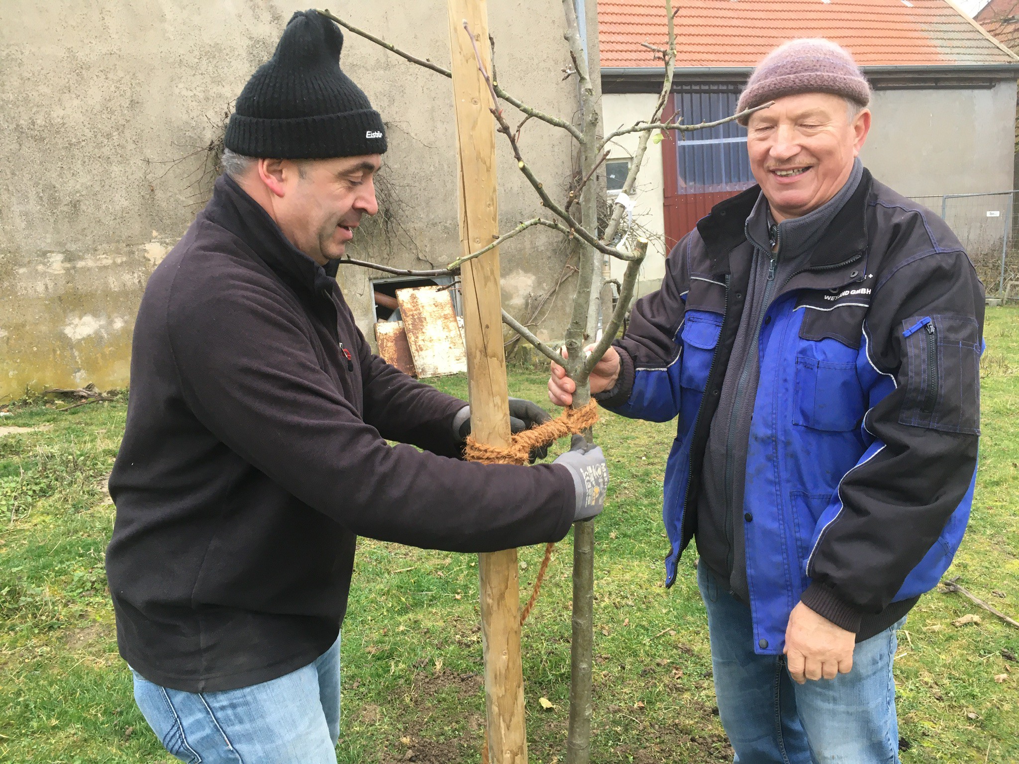 Angeleitet wurde die Anwesenden von Herrn Schwemmer aus der Baumschule „ Hof Zellesmühle“, der darüber hinaus bereitwillig Tipps zur Baumpflege, dem Anbinden der Bäume und den Vor- und Nachteilen der verschiedenen Sorten weitergab. „Dass wir die ganze Arbeit an einem Tag schaffen hätten wir nicht gedacht.“ freut sich Helmut Baumann am späten Nachmittag eines arbeitsreichen Tages bei einer Tasse Kaffee mit frischem Apfelkuchen. Die Nachbarn haben nicht nur Zeit, sondern auch Gerät eingebracht, um beispielsweise die Bäume zu wässern. Am Ende sind sich alle einig: eine gelungene Aktion für Gemeinschaft und Umwelt.