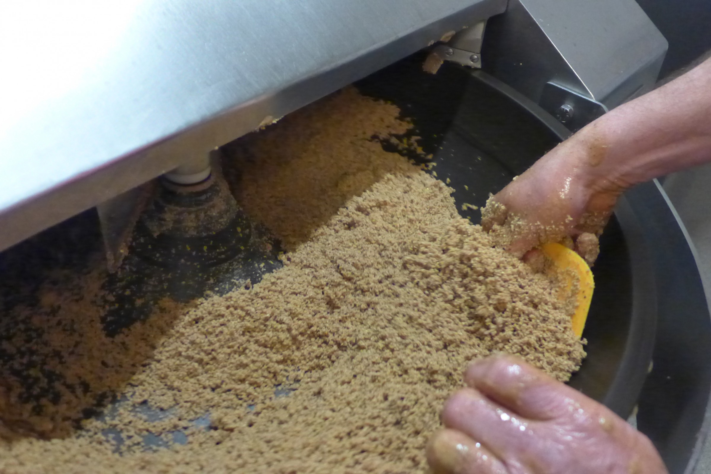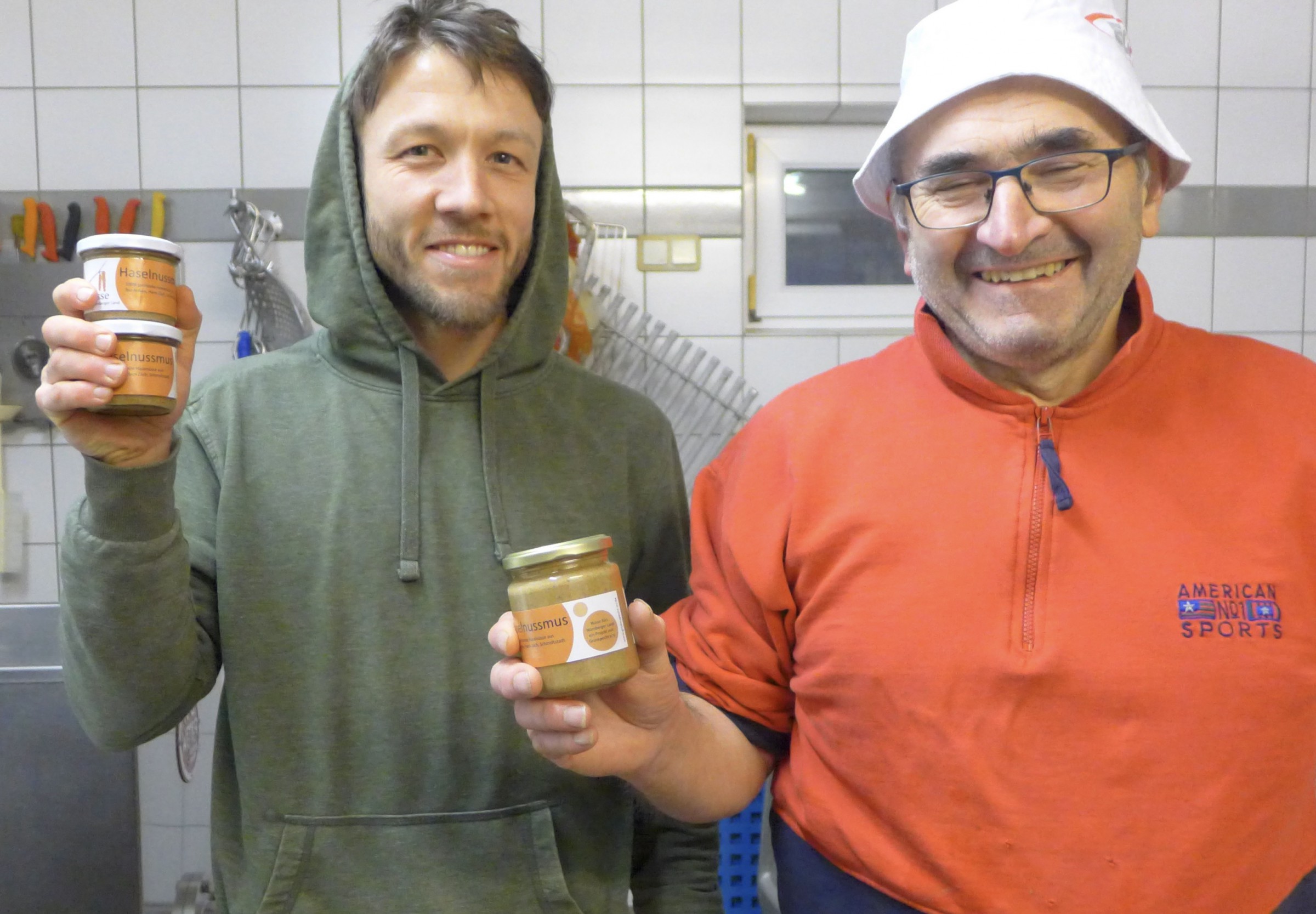 Letzlich haben wir jedoch 15 kg handverlesene, geröstete Haselnusskerne zusammenbekommen. Dank des zwar pensionierten, aber umtriebigen und experimentierfreudigen Metzgers Georg Büchel aus dem Nachbarort Ottensoos konnten wir die Haselnüsse im letzten Veredelungsschritt zu cremigem Mus zermahlen. Im Wurst-Cutter seiner ehemaligen Metzgerei geht das nämlich erstaunlich gut. Davon war auch die Familie Büchel begeistert, die uns diese geniale Methode nun schon zum zweiten Mal ermöglicht haben. Vor einigen Jahren hat die Familie schon vegane Aufstriche und Würste produziert und in ihrem Laden verkauft. "Die veganen Bratwürste waren köstlich. Aber wir waren unserer Zeit wohl zu weit voraus, sie wurden einfach zu wenig gekauft." erinnert sich Georg Büchel. Wir hatten jedenfalls viel Spass dabei, mit diesem humorvollen Menschen das Haselnussmus zu machen.