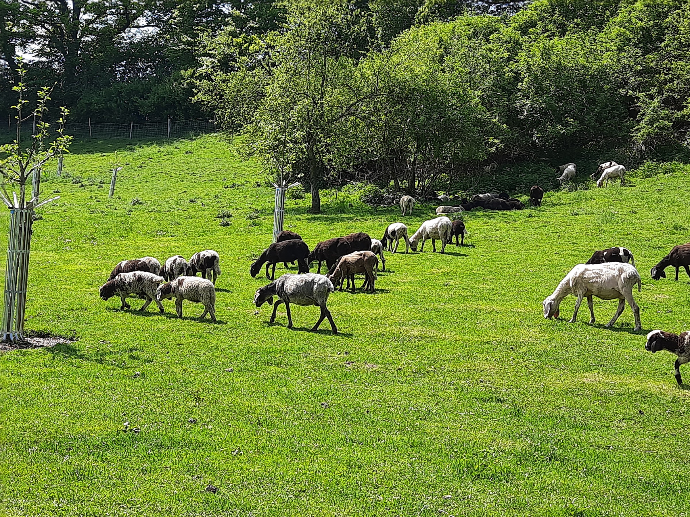 Eine weitere Nutzungsmöglichkeit von Streuobstwiesen ist die Schafbeweidung. Dabei entstehen mit abgestimmten Weidekonzepten artenreiche Wiesen. Mit wetterfesten und langlebigen Schutzgittern werden die Baumstämme vor Verbiss geschützt.