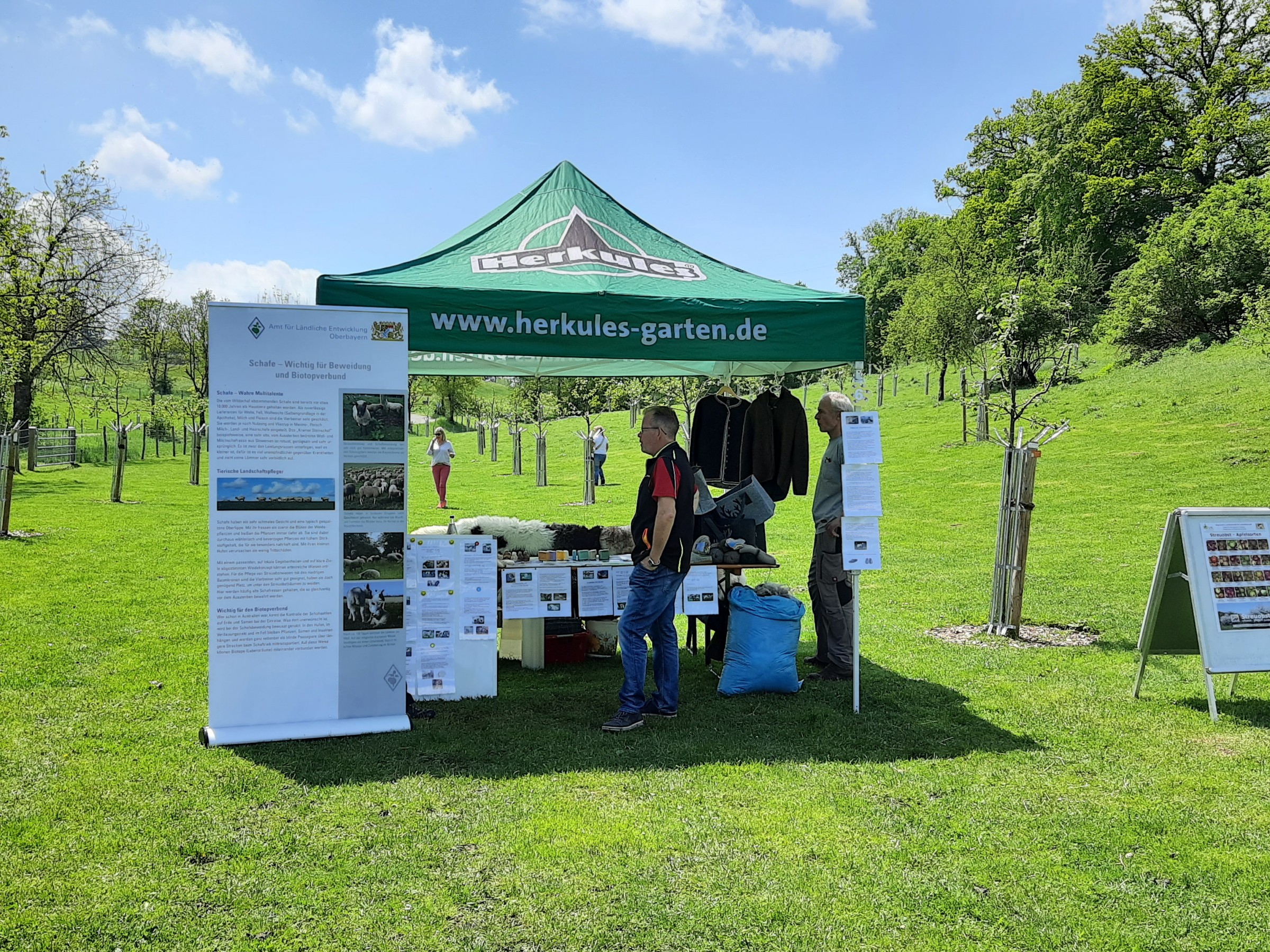 Am 14.5. kamen auch die Sinne nicht zu kurz: Am Lehrbienenstand von Hubert Mayr schaute man direkt ins arbeitsame Bienenvolk hinein und fühlte unmittelbar die unterschiedlichen Temperaturen eines Bienenstandes. Frischer Honig direkt aus der Wabe und wertvoller Gelee Royal, mit dem die Bienenkönigin gefüttert wird, standen dort zum Probieren bereit. Mayrs Bienen bestäuben die Obstblüten auf den Hohenberger Streuobstwiesen. Helga Lindner und Jakob Monn zeigten an ihrer Schafstation die vielfältigen Schafprodukte, u.a. frisch geschorene Schafwolle, Schafseife, Wolljacken und Felle. Ihre Schafe weiden unter den Obstbäumen hier. Dietmar Valentin gab fachkundigen Rat zur Anlage, Pflege von Streuobstwiesen und zu den vielen Obstsorten. Dazu gab es bei Interesse eine Privatführung auf dem Gelände. Bei selbstgemachtem Kuchen und erfrischendem Saftschorle ließ es sich gut fachsimpeln. Die Mitglieder des Vereines für Gartenbau und Landespflege e.V. Eberfing um Claudia Dittmann brachten die Leckereien mit und spendeten den Erlös im Anschluss an die Weilheimer Tafel. Ein rundum gelungener Tag!