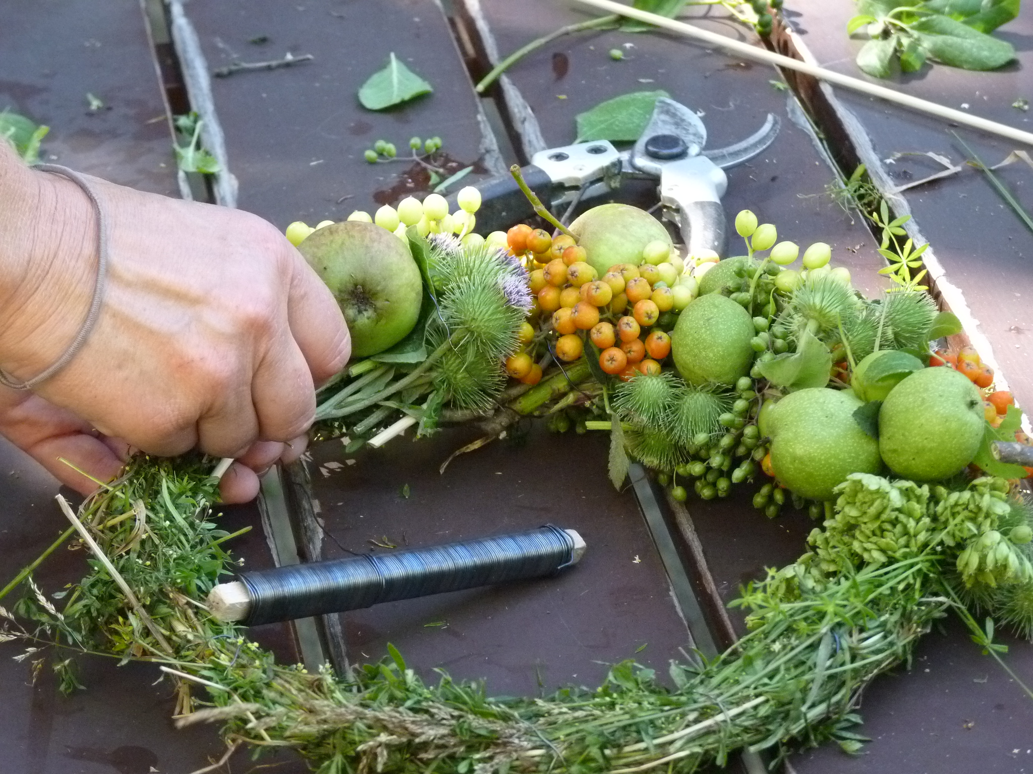Die Naturfloristin zeigte am Nachmittag die Technik des Blumenstraußbindens und wohin welche Pflanze wegen ihrer Eigenschaft am besten platziert wird, damit der Strauß ein heimisches Kunstwerk wird. Aber nicht nur einen klassischen Strauß hatte Regina in petto. Kleine und feine Werkstücke wie Mobiles, Kränzchen, Schalen und vieles mehr wurden gefertigt aus den heimischen Pflanzen und deren Früchten, wie sie einzigartiger nicht sein konnten.