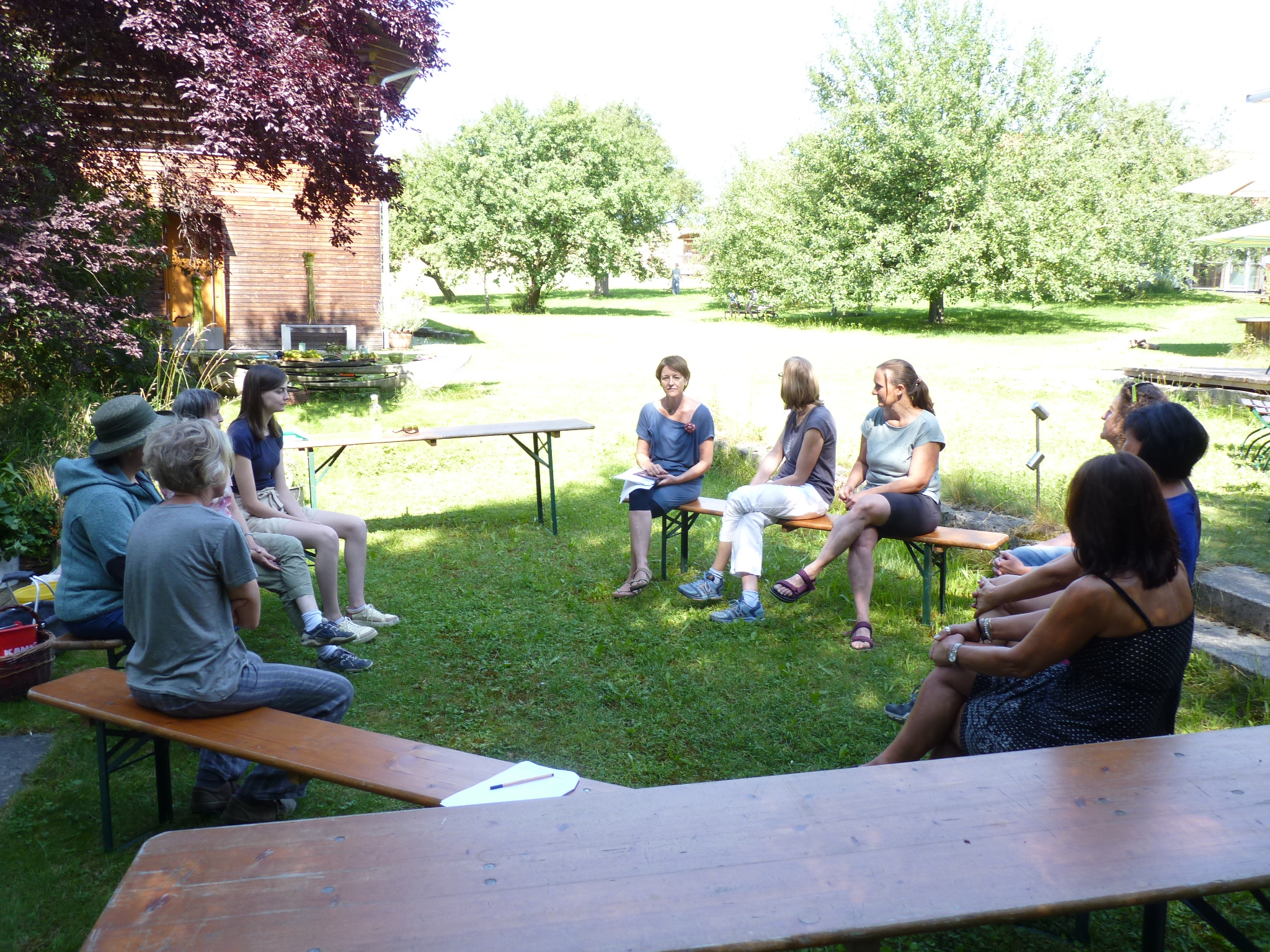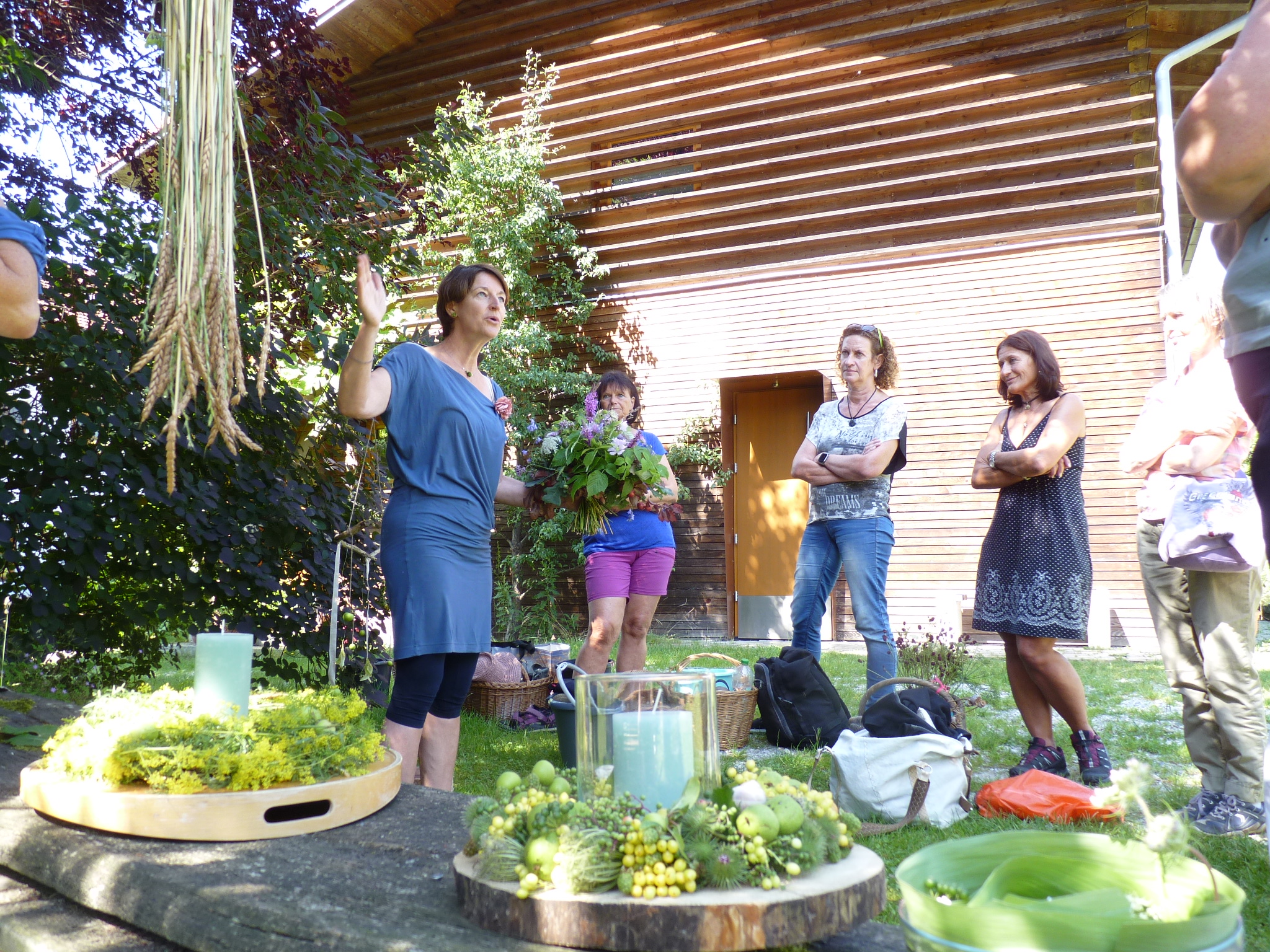 Regina Kaufmann leitete mit einem Text zur Jahreszeit Sommer den Kurs ein und regte damit zum Nachdenken und zur Dankbarkeit an, was der Sommer mit seiner Fülle an Früchten und Blumen hervorbringt.