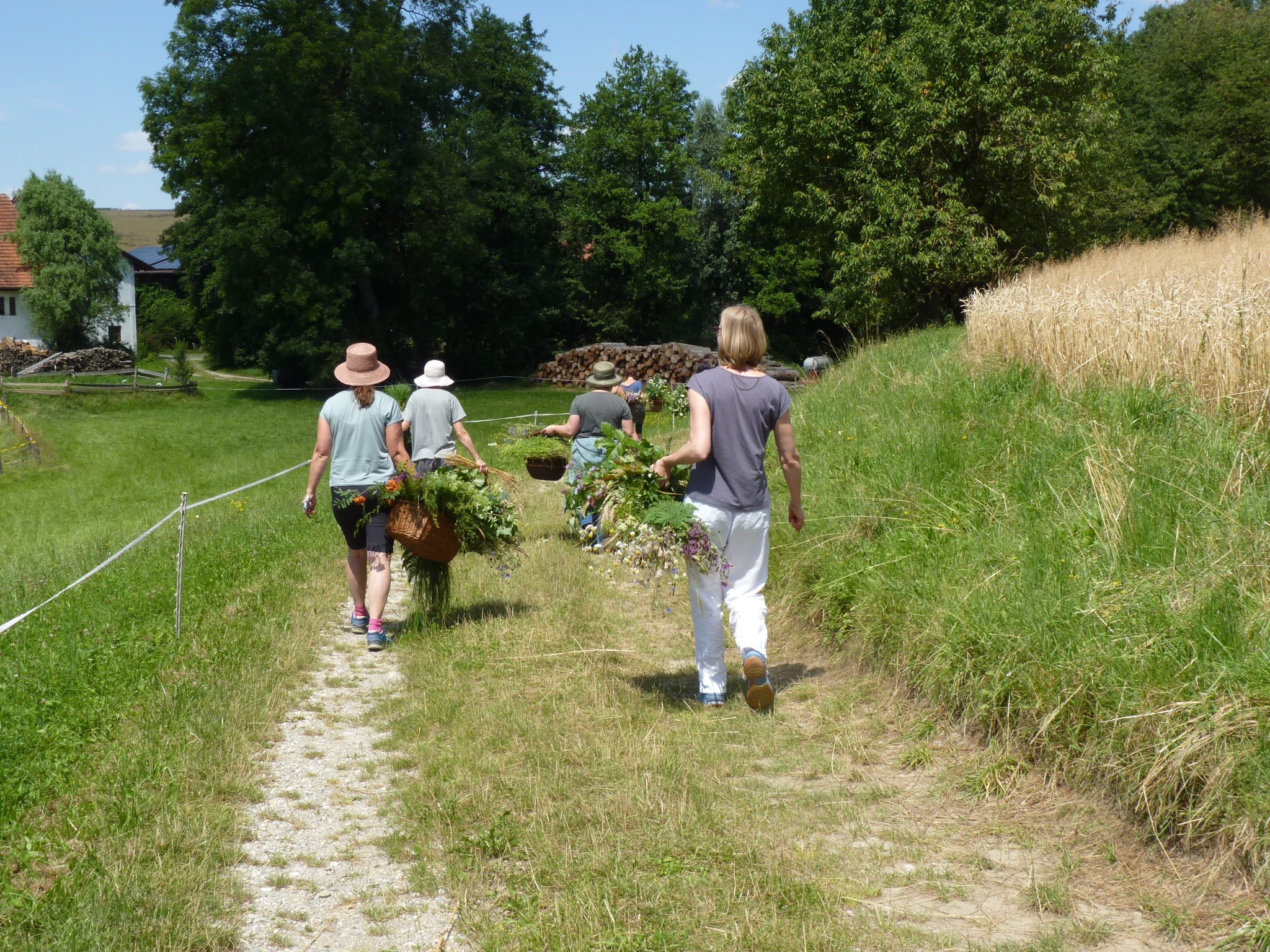 Auf einem ausgedehnten Sommerspaziergang durch die Felder und den Wald um Schafdorn herum sammelten die Teilnehmerinnen unter Anleitung von Regina eine Vielfalt an Wildkräutern und lernten dabei die Bedeutung der Pflanzen und die Vielfältigkeit der Landschaftsstruktur für Fauna, Flora und Mensch kennen.