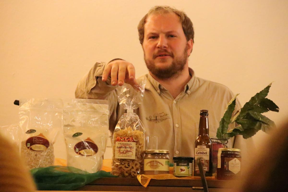 Zum Mitnehmen für zuhause gab es die Esskastanie in verschiedenen Formen: Als Nudeln, Mehl, Bier und Schokolade des kleinen österreichischen Vereins „D´Kaestnklauba“, als Honig aus der Pfalz sowie als Esskastaniensämlinge des Kastanienzuchtprogramms der Referent*innen Franziska Wolpert und Hendrik Gaede.