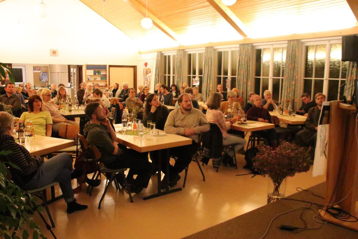Doch nicht nur kulinarisch überzeugte die leckere Brotbaumfrucht an diesem Abend, sondern auch als Hoffnungsträgerin in einer Zukunft, die laut Weltagrarbericht aufgrund degradierter Böden nur noch 60 weitere Ernten bereit hält. Nachdem Franzi und Hendrik in ihrem Vortrag zunächst auf diese alarmierenden Aussichten bzw. Gegenwärtigkeiten in der Landwirtschaft aufmerksam gemacht hatten, weckten sie mit ihrem Ansatz der essbaren Baumlandschaften als Ergänzung zum Ackerbau neuen Mut. Humusaufbau, Windschutz, Verdunstungskühle, tiefgründig durchwurzelte Böden – Es gibt viele gute Gründe Brotbäume in den Ackerbau zu integrieren. Dass sich besonders die Esskastanie mit ihrer langjährigen kulturellen Geschichte, ihren nahrhaften Früchten und den vielfältigen Verarbeitungsmöglichkeiten dafür eignet, zeigten sie im zweiten Teil ihres Vortrags. Den Beweis, dass die Esskastanie auch ganz lokal in unserer Region Zukunft hat, brachten nicht nur die in der Pause gerösteten Früchte aus Hersbruck, sondern auch unser dritter Gastsprecher des Abends: Land- und Forstwirt Hans-Hermann Nöhring aus der mittelfränkischen Gemeinde Emskirchen. In einer offenen Gesprächsrunde beantwortete er Fragen zu seinen erfolgreichen Anbauerfahrungen mit lokalen Sämlingen aus seinem Privatwald zur Waldverjüngung.