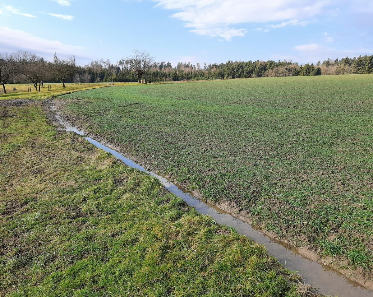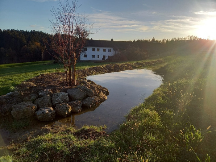 Oberhalb der Hofstelle wurde in Verlängerung der verbreiterten Rinne ein Mini-Rückhaltebecken geschaffen. Am Rand des Beckens zur Hangkante hin befindet sich eine kleine Anhäufung, um das Becken zu stabilisieren. Dort wurden ebenfalls Sträucher und ein kleiner Baum gepflanzt. Das Wasser fließt zukünftig deutlich langsamer und in einem breiteren Strahl ab. Große Steine am Ausfluss des Beckens stören zusätzlich beim Abfließen des Wassers. So kann die Wasserkraft vermindert und die Erosion verhindert werden. Auf dem Titelbild sieht man, wie harmonisch sich das Ganze in die Landschaft einfügt, ganz so wie es sich die Familie Winkler vorgestellt hat.
