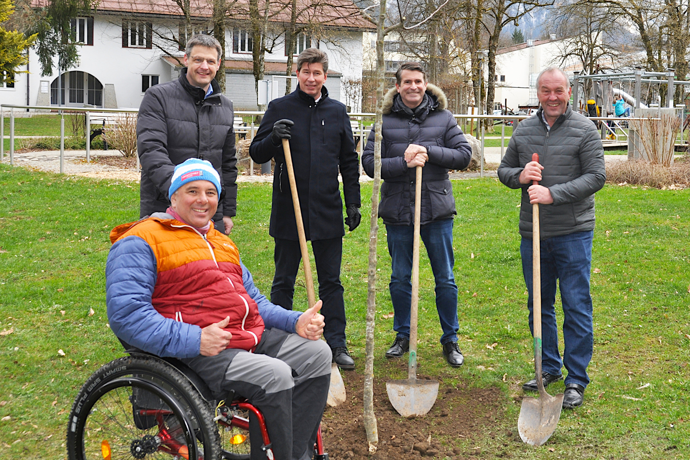 Vor kurzem wurden die insgesamt 119 Bäume geliefert und gepflanzt. Der Großteil davon sind Apfelbäume, aber auch ein Birnbaum, zwei Esskastanien und drei Walnussbäume sollen in und um Oberstdorf gedeihen. Einen der Apfelbäume schenkte der "Michl" der Gemeinde - für den örtlichen Fuggerpark, Teil der grünen Mitte Oberstdorfs. Gemeinsam mit Christian Kreye vom Amt für Ländliche Entwicklung (ALE) Schwaben, Bürgermeister Klaus King, Landtagsabgeordneten und Mitarbeitern des Bauhofs pflanzte Finger ihn nahe dem Kulturzentrum Villa Jauss. Die Äpfel, die der Baum hoffentlich in ein paar Jahren tragen wird, sollen der Bürgerschaft zugutekommen.