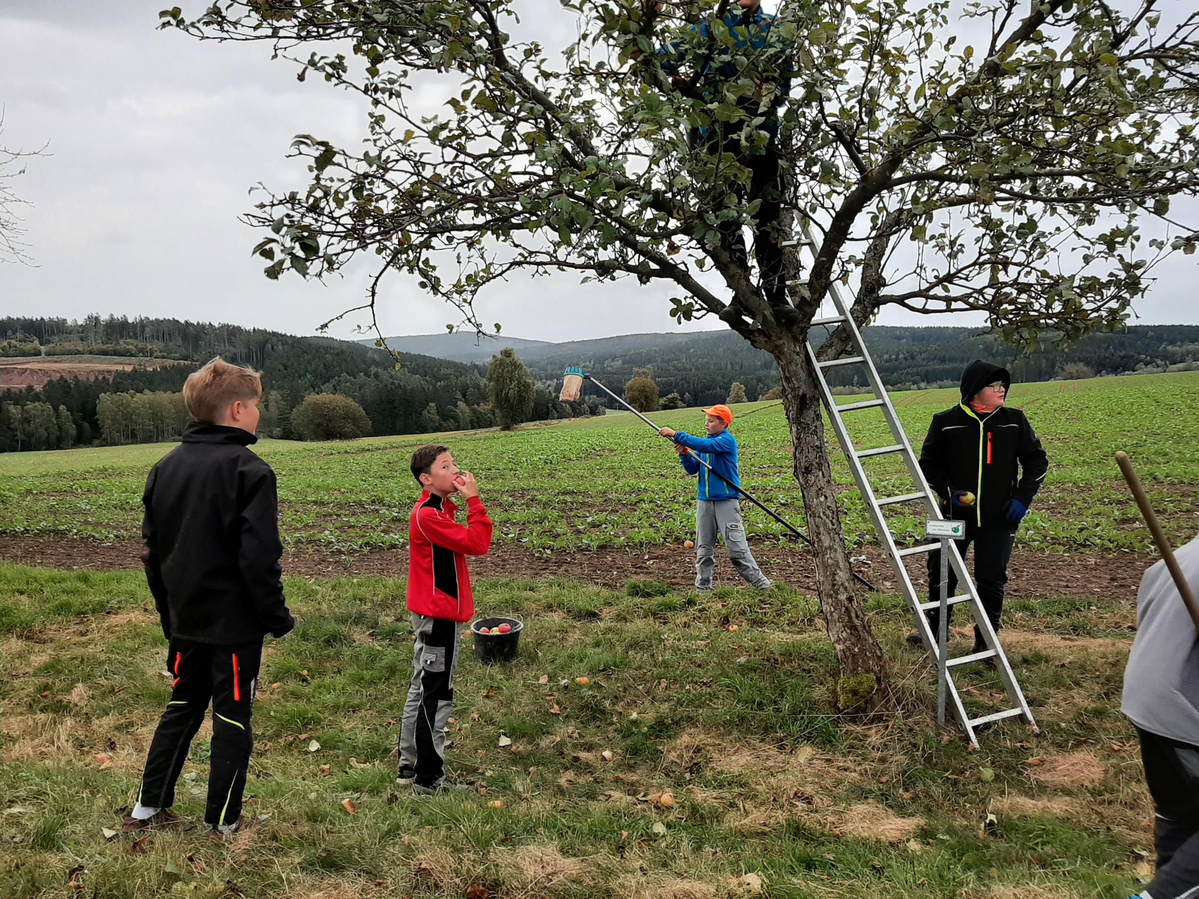 Es wurde geschüttelt, gepflockt, geklettert, gepflückt und aufgesammelt. Obwohl es am 27. September kalt, windig und regnerisch war, ließen sich die vielen fleißigen Helfer:innen und Helfer nicht aufhalten und sammelten das Obst vom Tännesberger Streuobstlehrpfad. Der Bestand ist bio-zertifiziert und gehört der Gemeinde, die daraus einen leckeren Saft pressen lässt. Verarbeitet werden die Äpfel von der Mosterei Bernhard aus Steinach. Für die großartige Unterstützung gab es am Ende neben einer finanziellen Belohnung auch eine kleine Brotzeit und natürlich Apfelsaft!