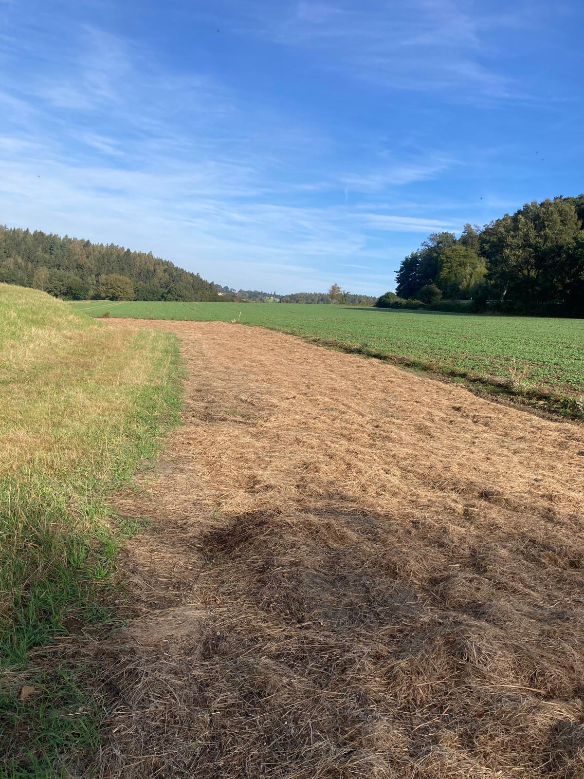 Der entscheidende Schritt zur Blühfläche war die Mahdgutübertragung. Hierbei wurde das Grüngut nach der Mahd artenreicher Flächen, die sich in der Nähe der zukünftigen Blühfläche befinden, auf diese aufgebracht. Dann wurde gewartet bis die Samen auf den Boden fallen und anschließend wurde das Grüngut abtransportiert. Nun heißt es warten. Im nächsten Jahr wird sich zeigen welche Arten dort wachsen. Mit der richtigen Pflege wird in den kommenden Jahren nach und nach eine wertvolle Blühfläche entstehen.