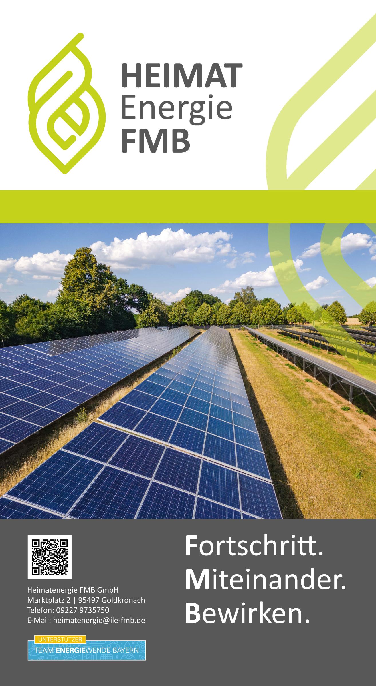 Die Heimatenergie FMB GmbH hat in den letzten Jahren bereits acht Dach-Photovoltaik-Anlagen auf kommunalen Liegenschaften errichtet, da sie sich gut für eine schnelle Umsetzung eignen. Die PV-Anlagen befinden sich in Goldkronach, Harsdorf, Stammbach und in Neuenmarkt. Zwei weitere PV-Anlagen werden noch in Gefrees und Trebgast installiert (Stand 24.09.2025). Die Anlagen erbringen eine Gesamtleistung von 400 kWp und wurden durch die Sparkasse Bayreuth über ein KfW-Förderprogramm (Kreditanstalt für Wiederaufbau) finanziert.