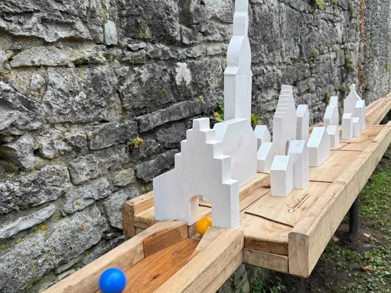 Eine Kugelbahn aus Holz erstreckt sich seit Kurzem 116 Meter entlang der Sommerhäuser Dorfmauer. Es gibt zwei parallel verlaufende Strecken. So können die Nutzer auch einen Wettbewerb austragen. Hauptzielgruppe sind die bis zu Zwölfjährigen. Aber – wie sich bisher zeigte – hat Groß genauso viel Spaß wie Klein.