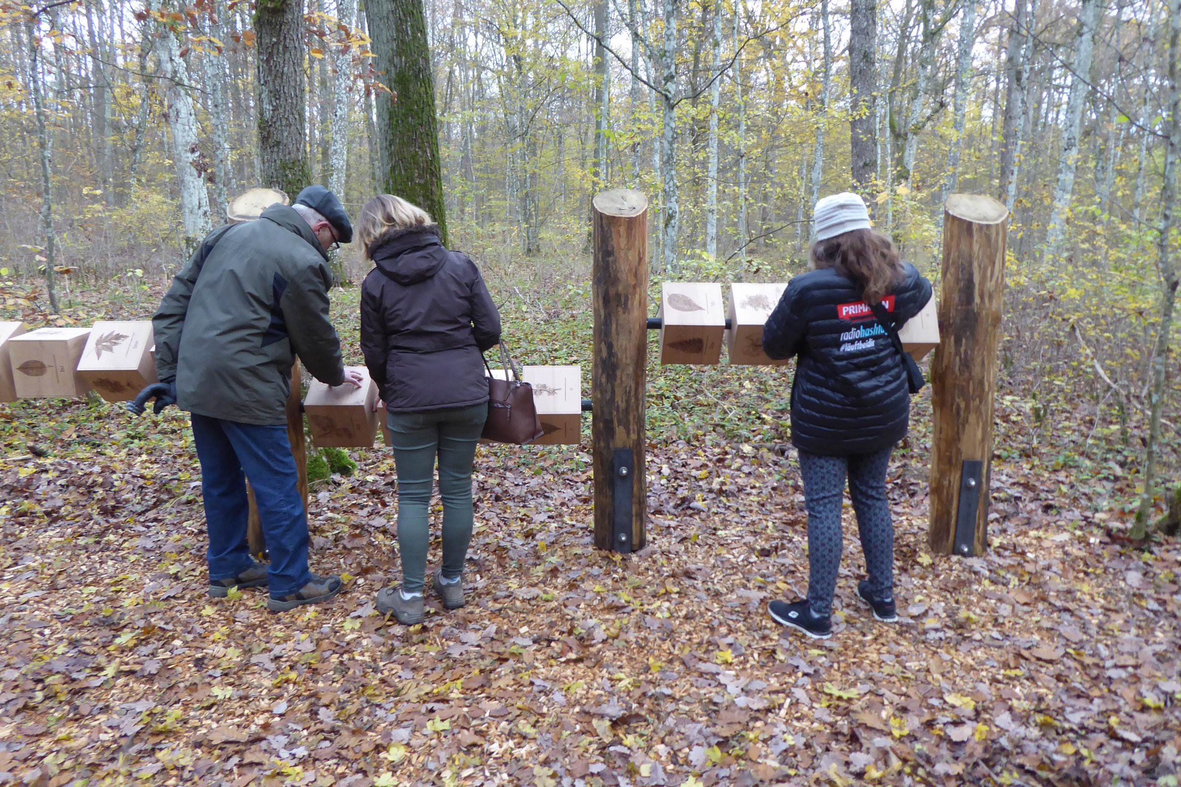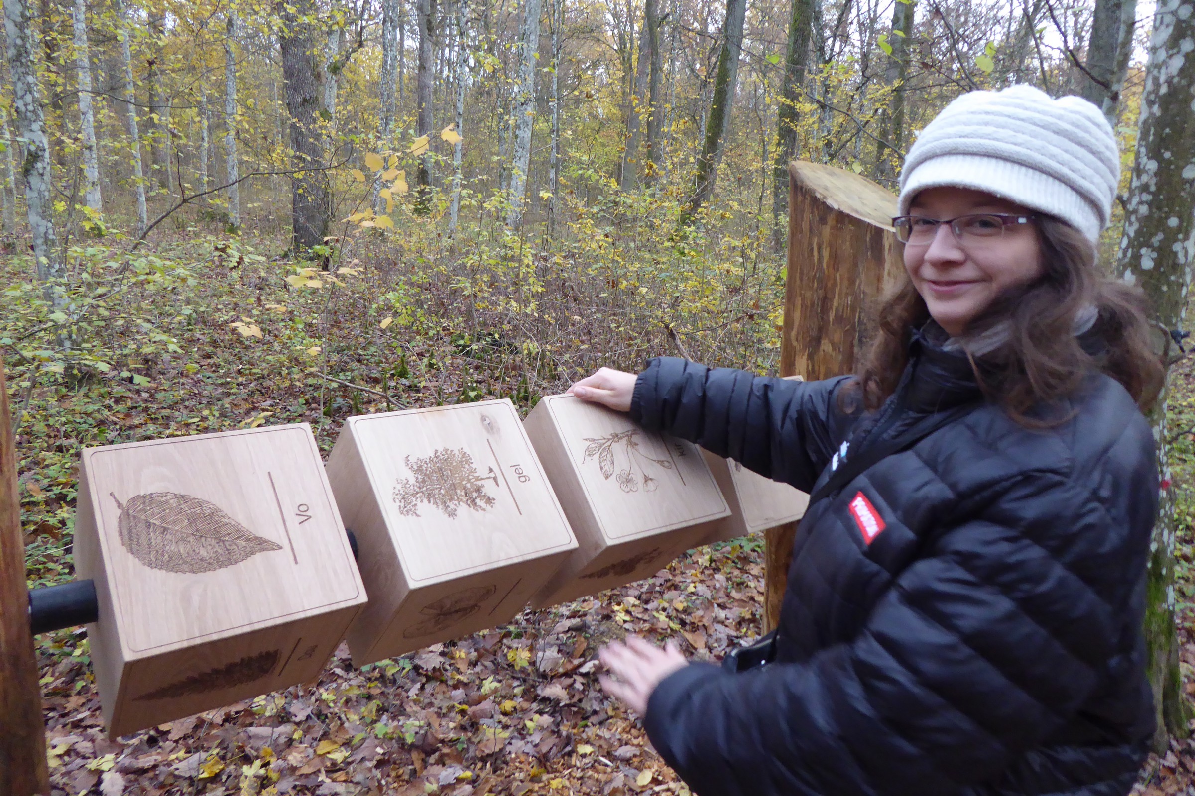 Dass man mit Bäumen auch spielen kann, dürfte nicht nur Kinder begeistern. „Wir haben zwölf verschiedene Baumarten auf vierzehn Hektar Wald, das sind ziemlich viele“, sagt Lia Stefke, und um diese Vielfalt zu erfahren, gibt es nun das „Baumpuzzle“. Drehbare Eichenholzwürfel, die mit den zusammenpassenden Symbolen für Blatt, Blüte, Frucht und Wuchsform den Namen des Baumes ergeben, laden zum Knobeln ein. Die Symbole sind aber nicht als Bild auf die Würfel aufgeklebt, sondern fühlbar in das Holz hinein gelasert. Das ermöglicht auch Menschen mit Handicap, die Strukturen zu erkennen. Im gesamten Wald gibt es dann auch immer wieder kleine Tafeln an den entsprechenden Bäumen, an denen man die erfühlten Bäume wiedererkennen kann. Besonders spannend wird die Erkenntnis, dass sich der gleiche Baum in verschiedenen Altersstufen ganz unterschiedlich präsentiert.