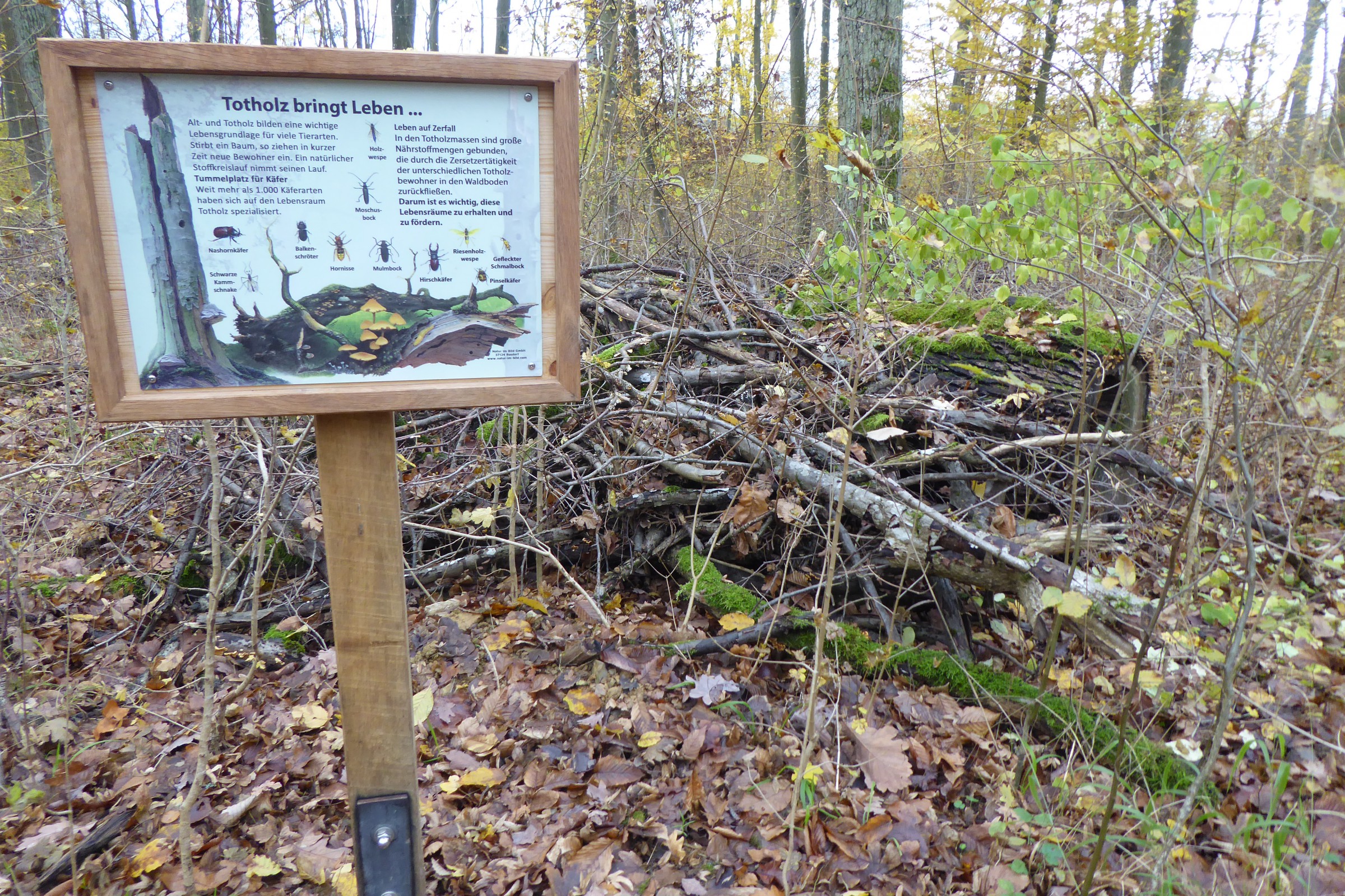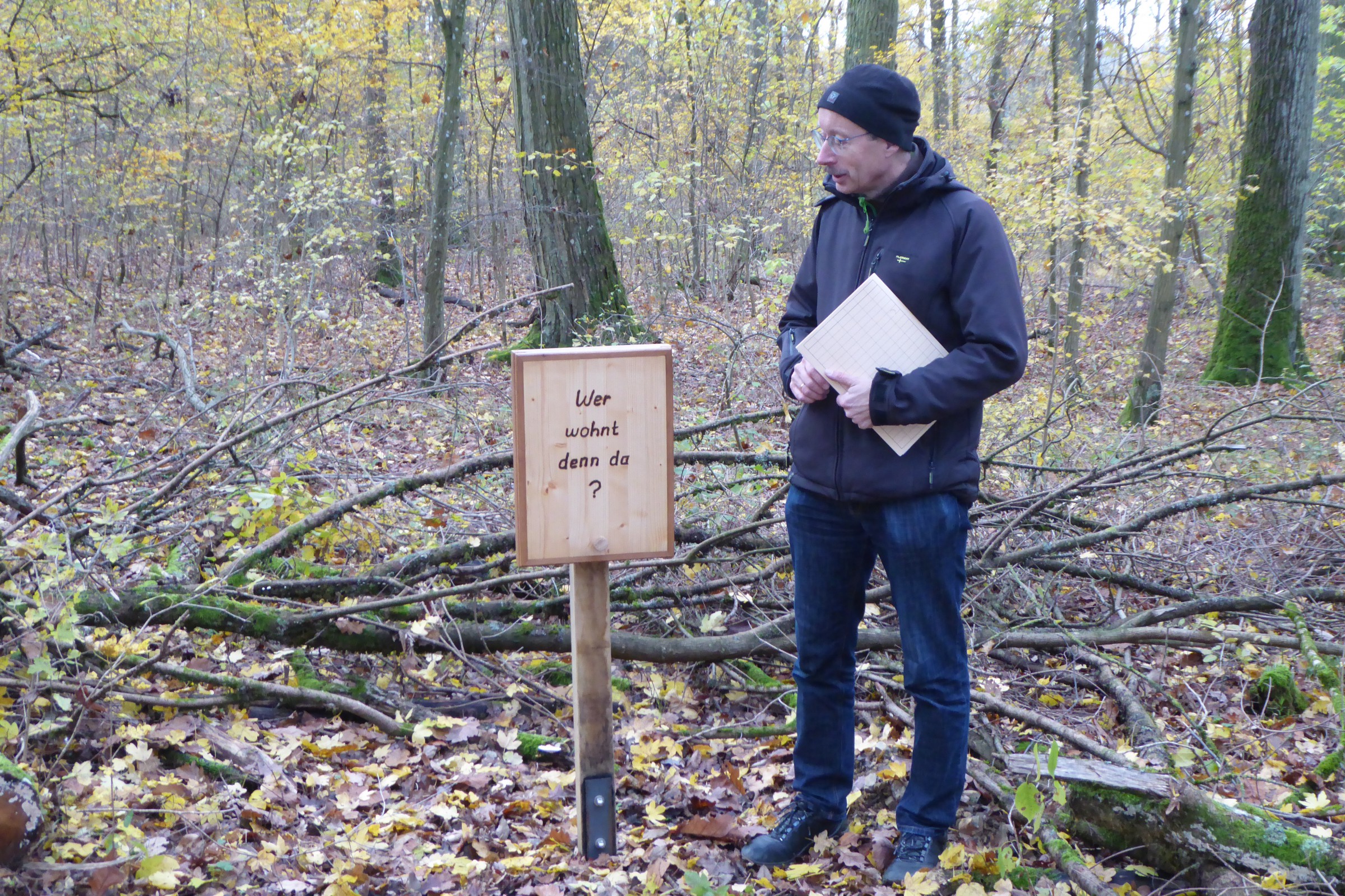 Selber suchen und erkennen ist die Vorgabe, dafür gibt es keine festen Stationen, sondern über das gesamte Waldlehrpfadgelände verteilte Biotope und Lebensräume, die es zu erkunden gilt. Biotopbäume zum Beispiel, also Bäume, die Höhlen für den Specht oder Spalten für Fledermäuse bergen. Steinhaufen, in denen sich mit Geduld Spinnen, Reptilien, Käfer und Wanzen entdecken lassen. Oder Totholzäste, die Kinderstuben für viele Kleintiere sind – all das gibt es ja schon im Wald. Neu dazu kamen Lebensräume, die dazu einladen, selbst zum Teil der Natur zu werden.