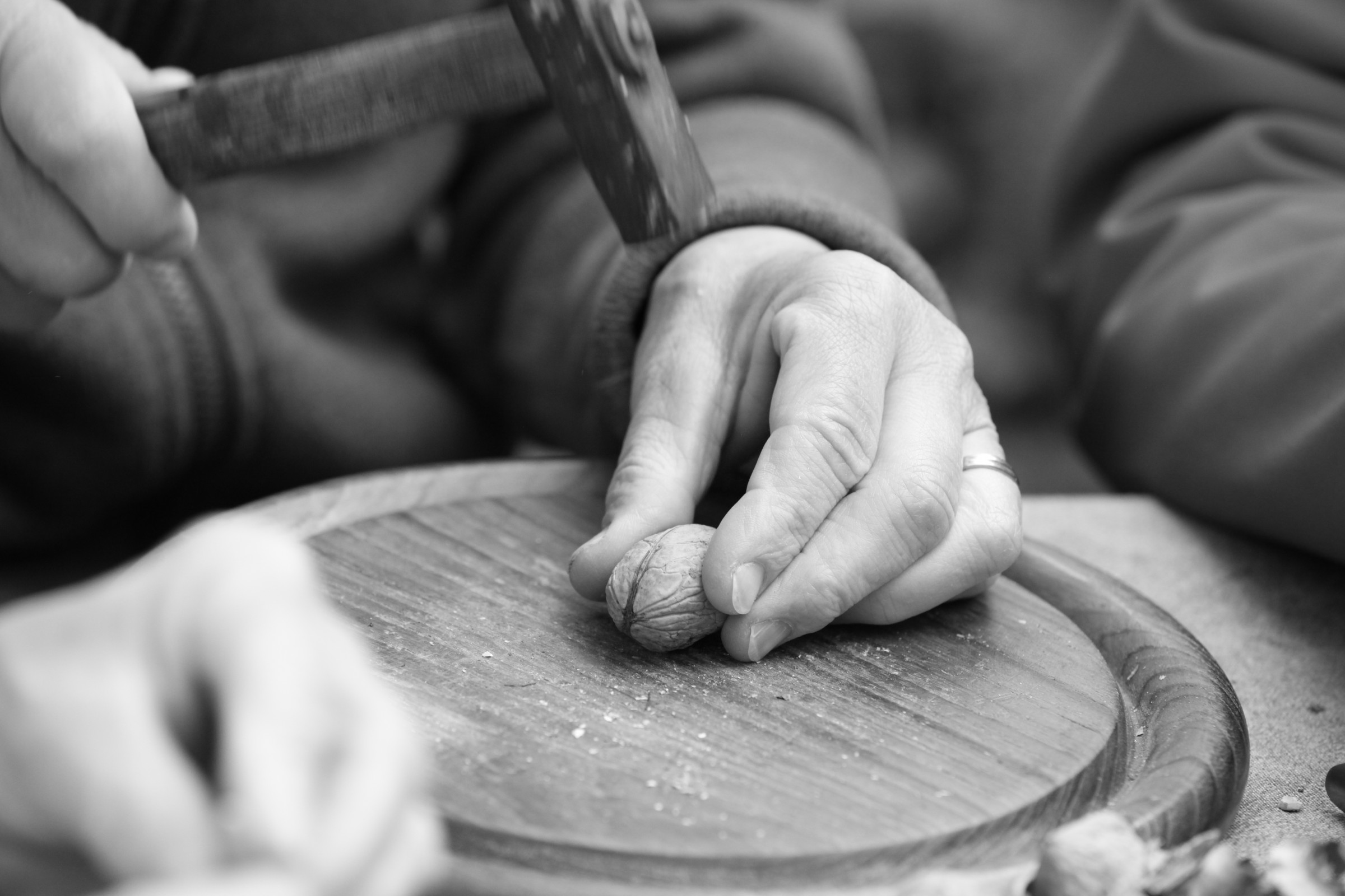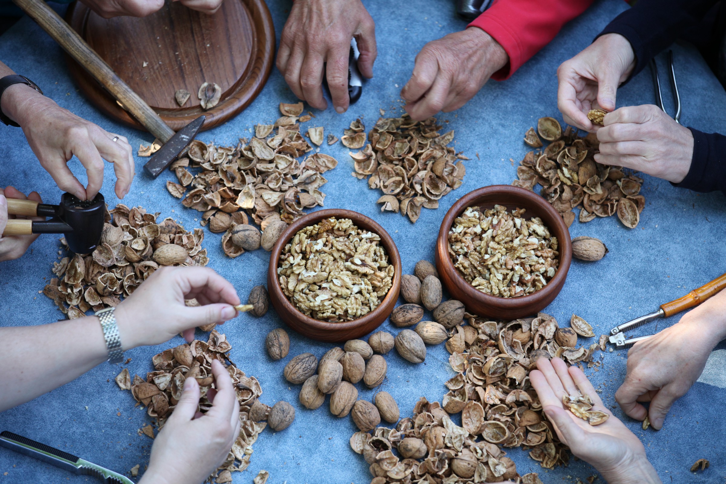 Doch vor dem Verarbeiten steht das Nüsseknacken. Mühsam ist das. In großer Runde aber viel leichter. Statt alleine vor einem großen Berg Nüsse zu sitzen, trifft man sich zum Knacken, das ist allen, die dabei sind, ganz wichtig. „Wir haben gar nicht gedacht, dass das Gesellige so eine große Rolle spielt“, erzählt Maria Maak. Mittlerweile sind 20 bis 25 Leute beim abendlichen Walnussknacken im November dabei. Der Platz in der Maak‘schen Küche, in der alles begann, reicht nicht mehr aus, künftig wird in einem Raum der Gemeinde geknackt. Es wird erzählt, gelacht, man sitzt zusammen und hat gleichzeitig das gute Gefühl, etwas zu bewegen und Teil einer guten Sache zu sein. Da passiert so ein fingerstrapazierendes Nüsseknacken fast nebenher. Übrigens hat jeder und jede so seine eigene Technik und eigenes Werkzeug, auf das er schwört. Sogar ein Hammer ist im Spiel. Danach geht’s eng getaktet in den heimischen Küchen weiter, zum Weihnachtsmarkt am ersten Adventswochenende muss schließlich alles fertig sein.