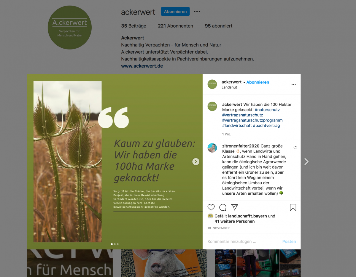 L. Degenfelder: A.ckerwert berät Eigentümer von landwirtschaftlichen Flächen dabei, ihre Pachtverträge so zu gestalten, dass ihre Äcker und Wiesen in ihrem Sinne, nämlich nachhaltig und naturverträglich bewirtschaftet werden. Dafür zeigen wir die Möglichkeiten auf, die es dafür gibt, und die am besten zu der Fläche und zu den Beteiligten passen.
