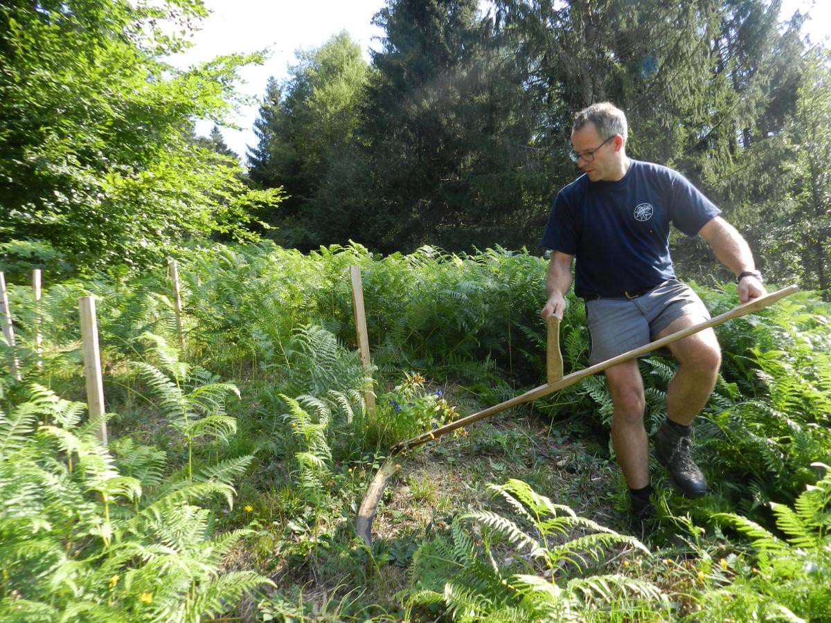 Weniger Glück bedeutete der Adlerfarn, der sich hier in weiten Teilen ausbreitet. Eine Herausforderung für den Hobbylandwirt, der die ehemaligen Viehweiden und Steilwiesen durch Schafbeweidung und extensive Bewirtschaftung wiederbeleben wollte. Denn Adlerfarn verdrängt durch seine Wuchshöhe von bis zu 2,5 Metern nicht nur andere Arten, er ist auch noch giftig für das Weidevieh. Gemeinsam mit Familie Gerstenecker entwickelten das ALE Schwaben und die Untere Naturschutzbehörde (UNB) Lindau daher ein Konzept zur Verdrängung des Adlerfarns – eine Kombination aus regelmäßiger Mahd und Trittbelastung durch Beweidung erwies sich dabei als das wirksamste Prinzip.