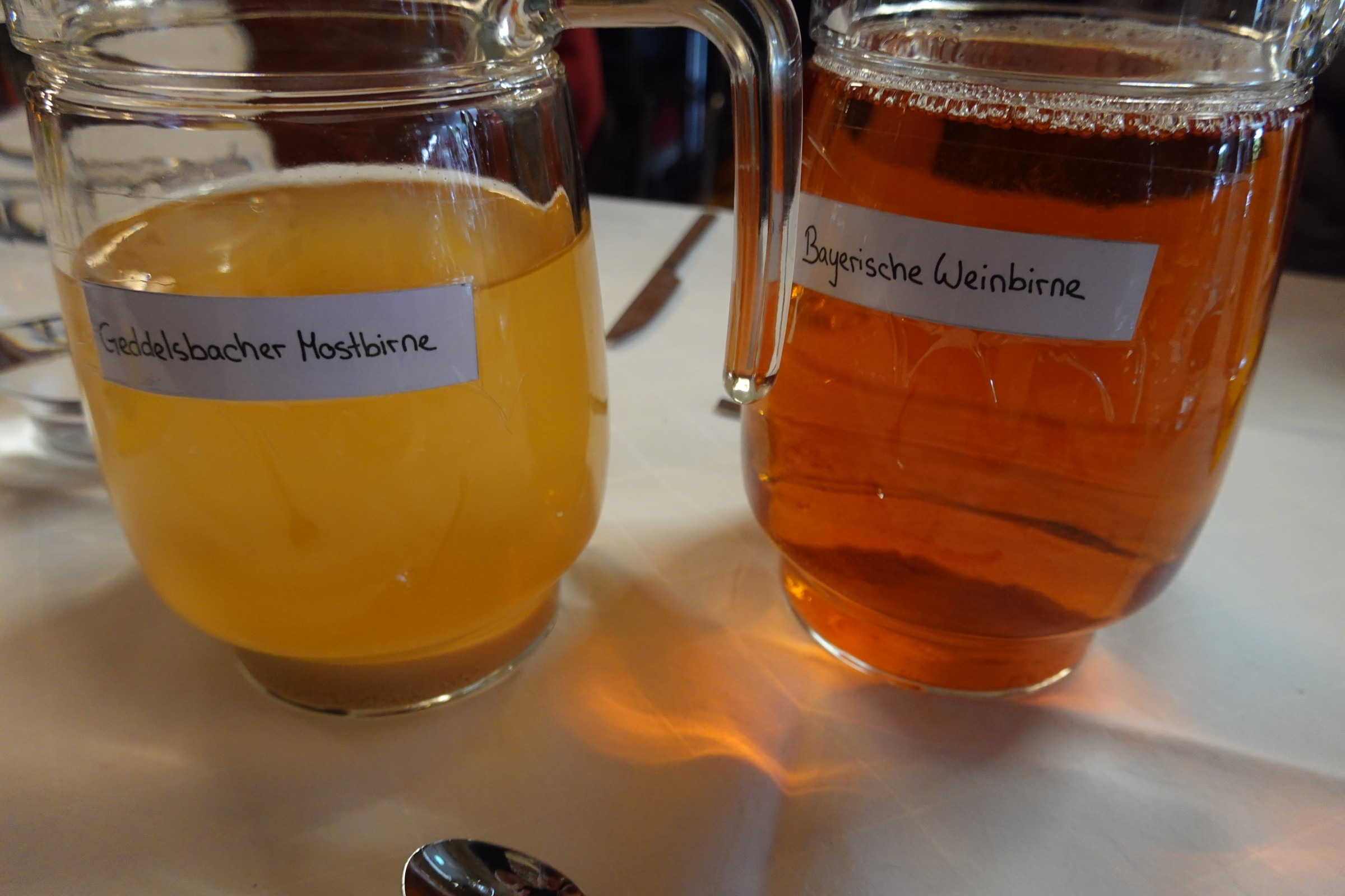 Sorten wie Geddelsbacher Mostbirne oder Bayerische Weinbirne, Cidre aus