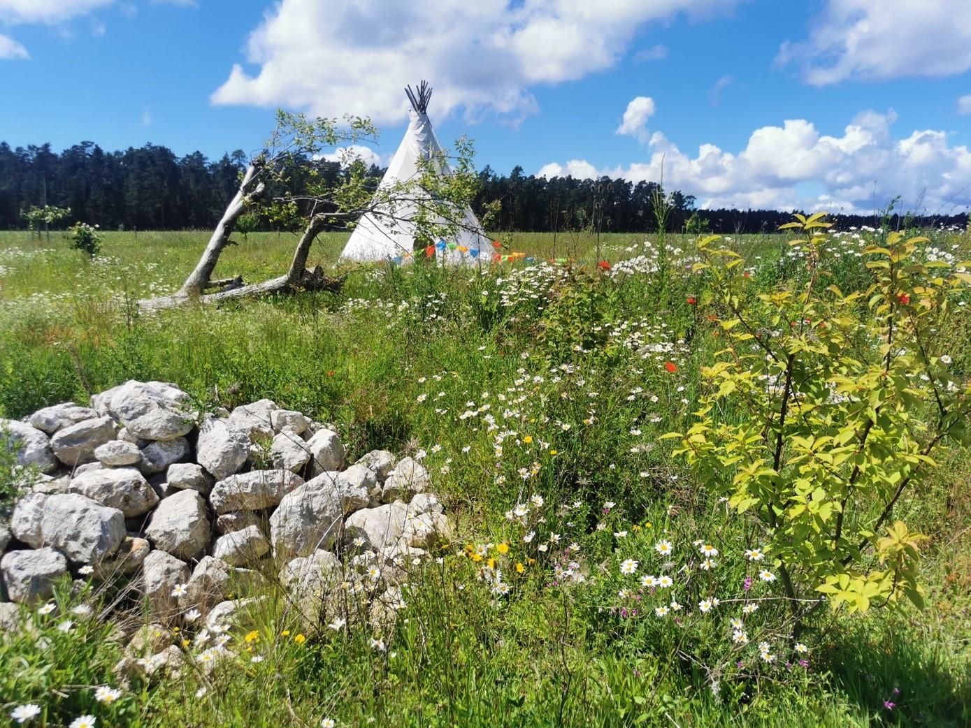 Rebhühner haben sich auf ihrer Fläche wieder angesiedelt. Auf den Blühstreifen tummeln sich Schmetterlinge und Hummeln. Auf einem Steinhaufen hat Judith Bub sogar schon eine Schlange entdeckt. Sie kommt ins Schwärmen, wenn sie von den Fröschen, Grashüpfern und Heuschrecken erzählt, die sie bei ihren Spaziergängen auf dem Gelände findet. Während des Vogelzugs landen auch Vogelschwärme auf ihrer Permakultur-Fläche. „Langsam erkennt man unsere angelegten Strukturen auch von weitem und man kann erahnen, wie es in ein paar Jahren aussehen wird!“, freut sie sich.